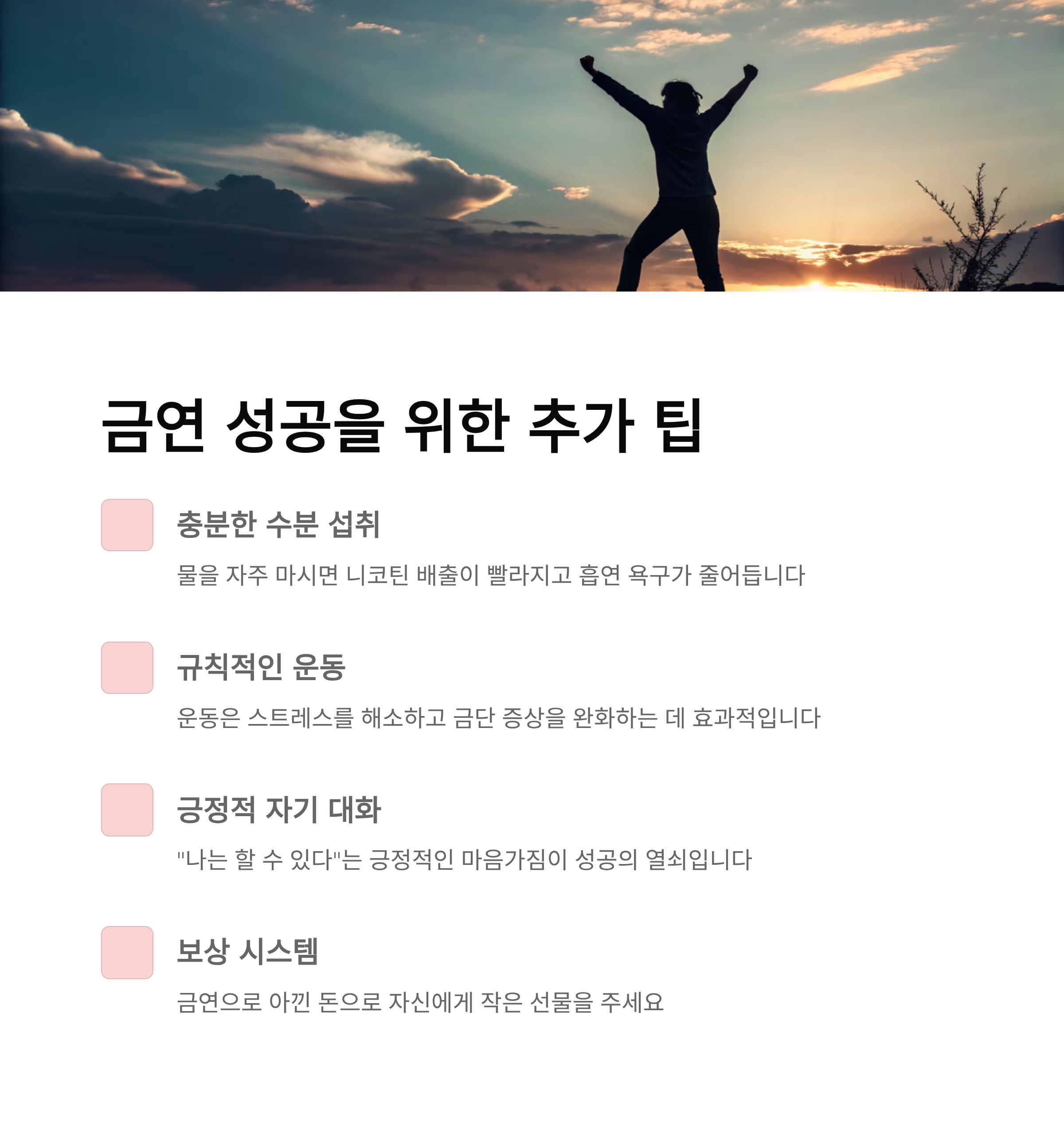 | 성공 팁 | 긍정적 마음가짐, 금연 일지, 수분/활동량/식습관 개선, 재발 방지 및 재도전 의지 | 실패해도 포기하지 않고 꾸준히 시도하는 것이 가장 중요 |