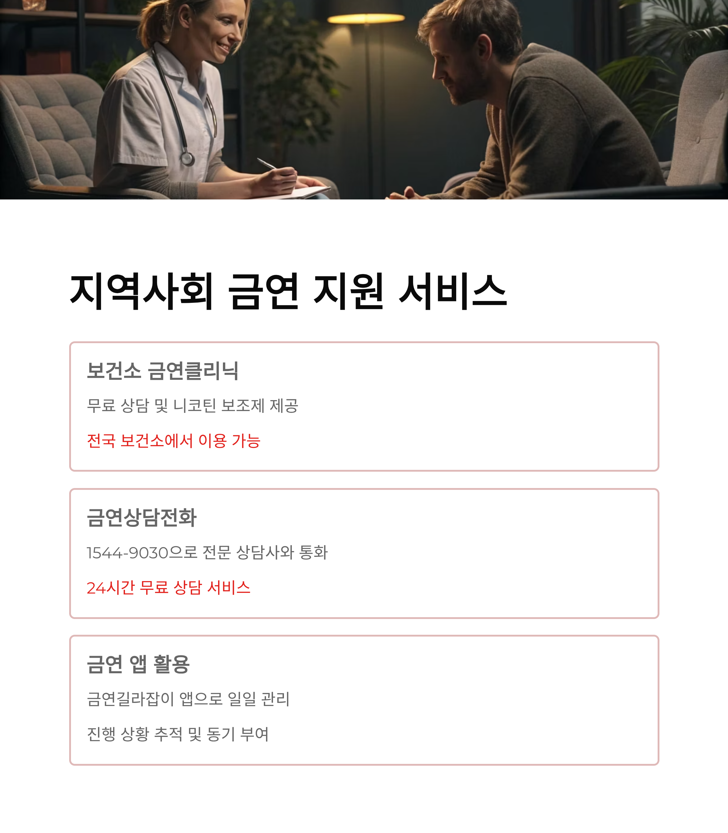 | 지역사회 지원 | 보건소 금연 클리닉, 지역 금연지원센터(금연 캠프), 금연 상담 전화(1544-9030), 건강보험공단 지원 |