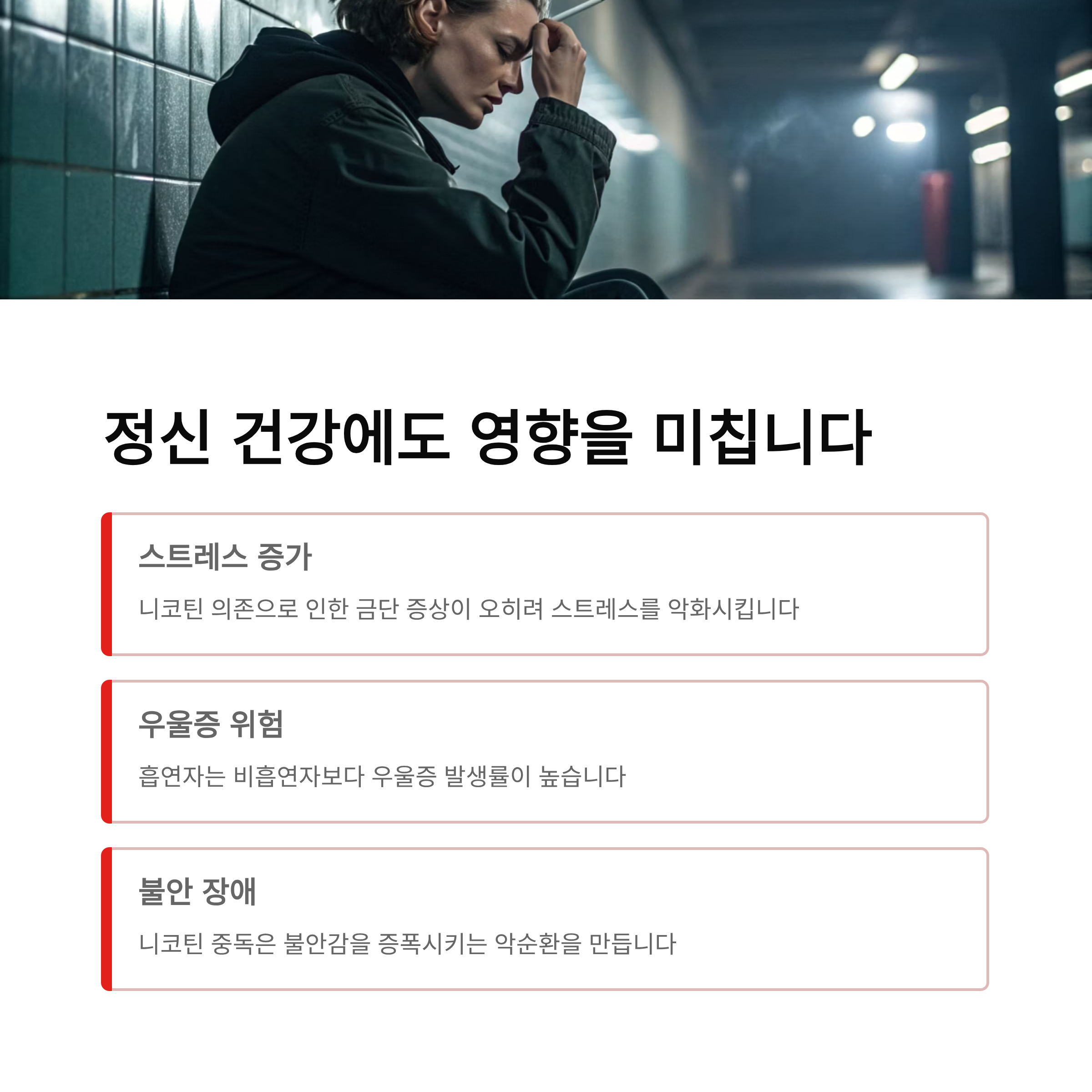 많은 흡연자가 담배가 스트레스 해소에 도움이 된다고 생각하지만, 실제로는 스트레스 감도를 약 2배 높이고 우울증 발생 위험을 1.7배 증가시키는 연구 결과도 있습니다. 니코틴 중독으로 인한 금단 증상은 짜증, 우울감, 불안, 집중력 감소, 불면증 등을 유발합니다.