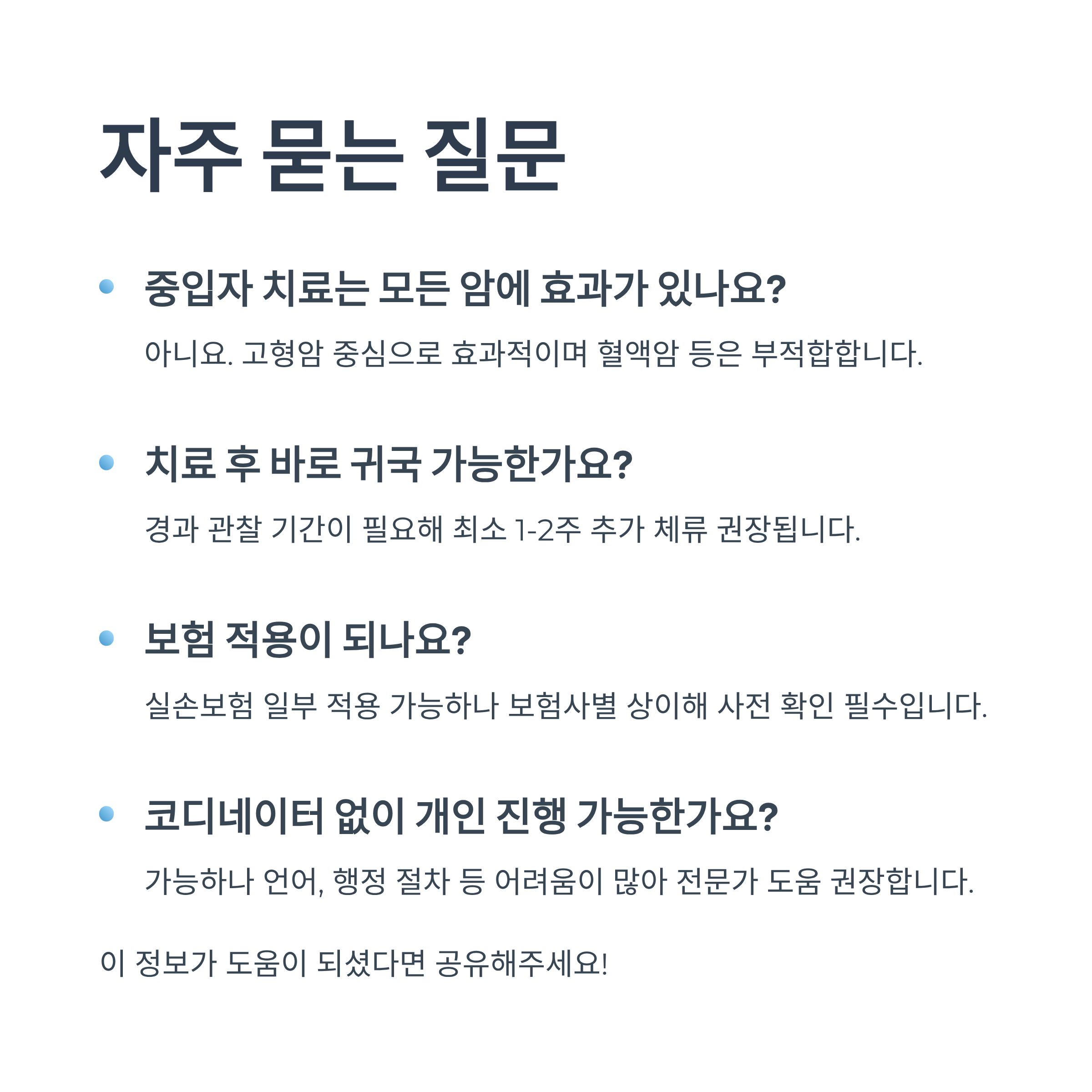 - 국내 치료 옵션과의 비교: 국내에서도 중입자 치료가 시작되었으며, 양성자 치료, 면역항암제, 표적항암제 등 다양한 첨단 치료법이 있습니다. 반드시 국내 주치의와 충분히 상담하여, 현재 자신의 상태에서 가장 효과적인 치료법이 무엇인지, 일본 중입자 치료가 정말 최선의 선택인지에 대한 의학적 판단을 구해야 합니다.