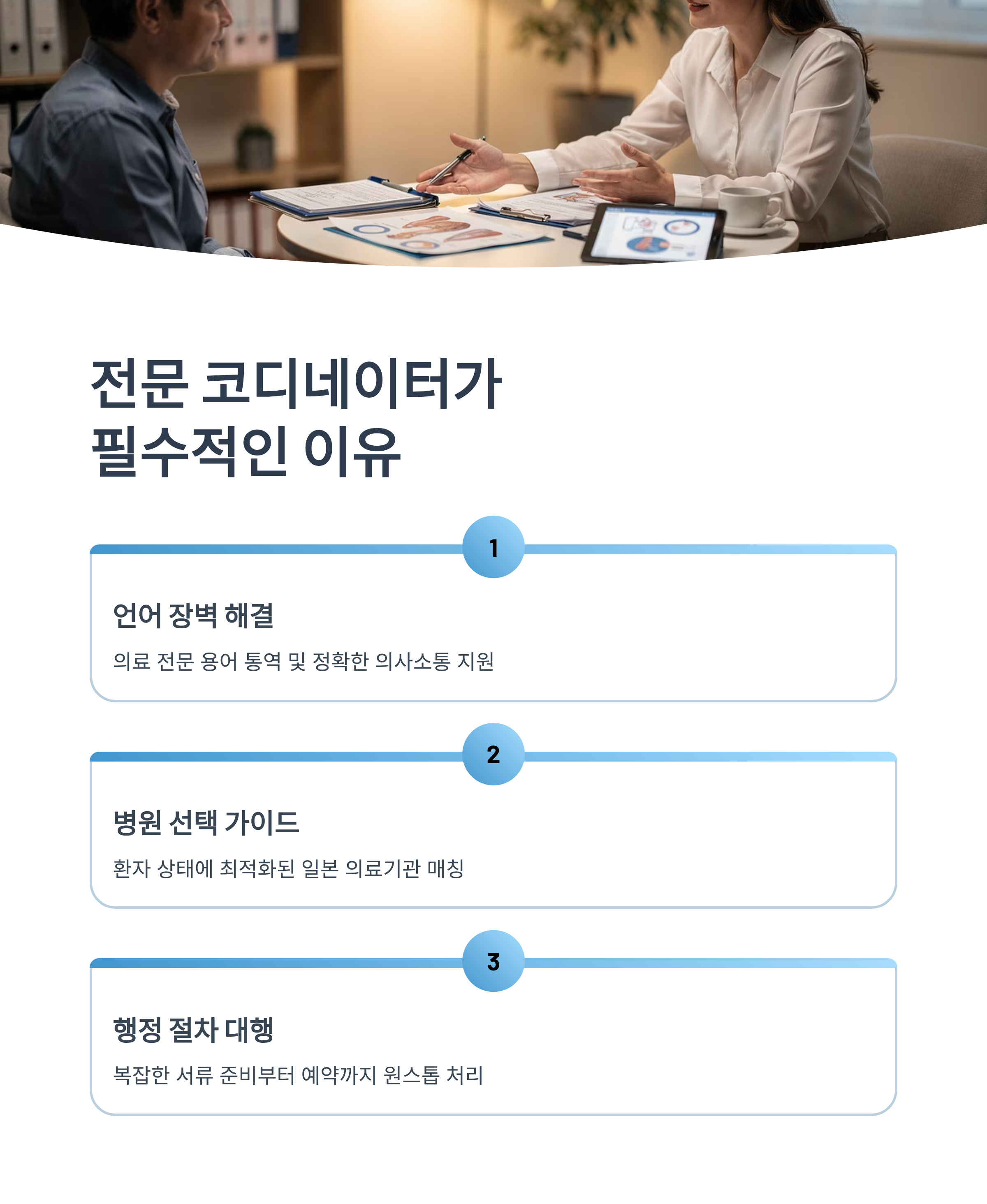 결론적으로, 전문 코디네이터는 시간과 비용을 절약하고, 시행착오를 줄이며, 치료의 성공 가능성을 높이는 가장 중요한 파트너라고 할 수 있습니다.