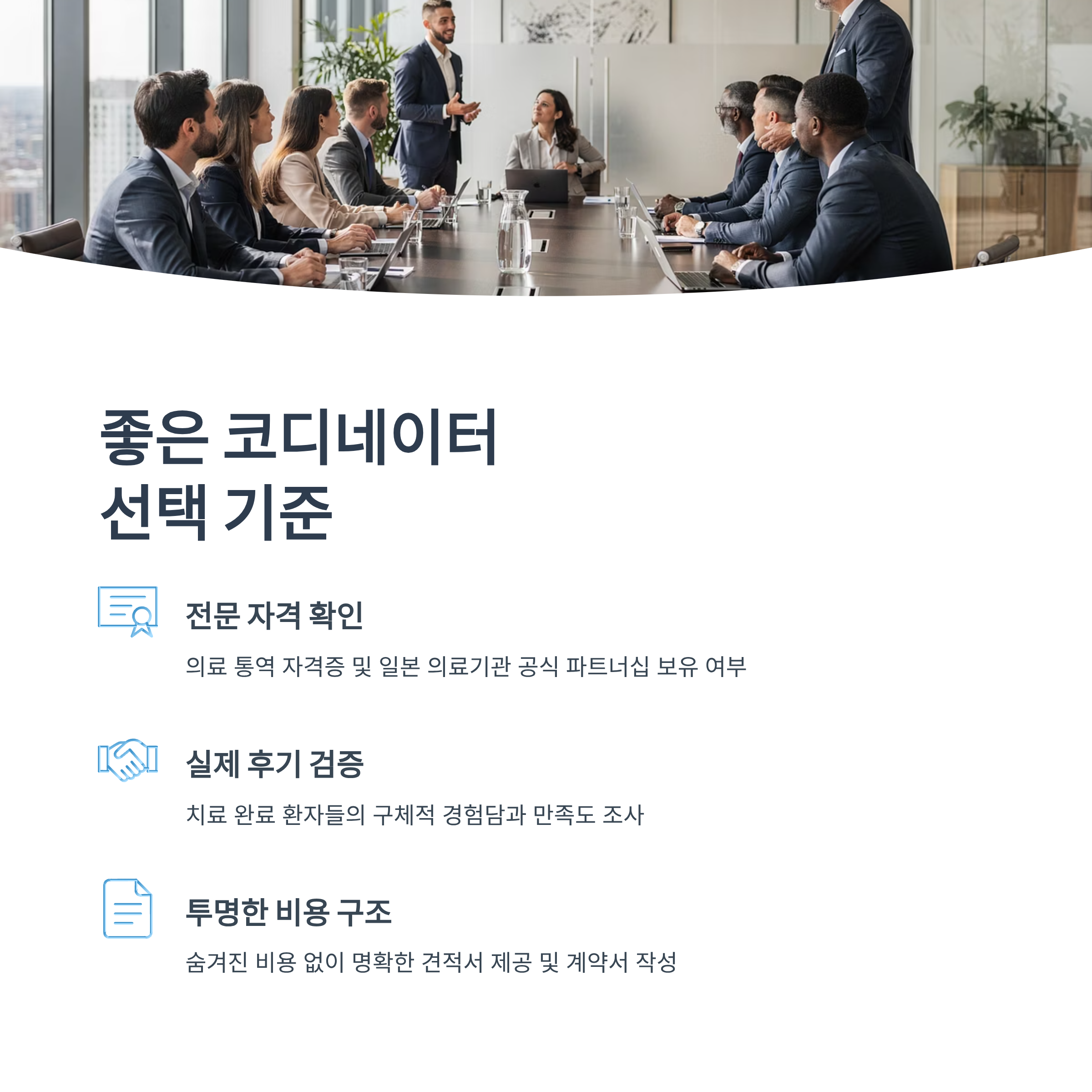 치료의 성패와 만족도에 큰 영향을 미치는 만큼, 신뢰할 수 있는 전문 코디네이터나 에이전시를 선택하는 것은 매우 중요합니다. 다음 사항들을 꼼꼼히 확인해보세요.