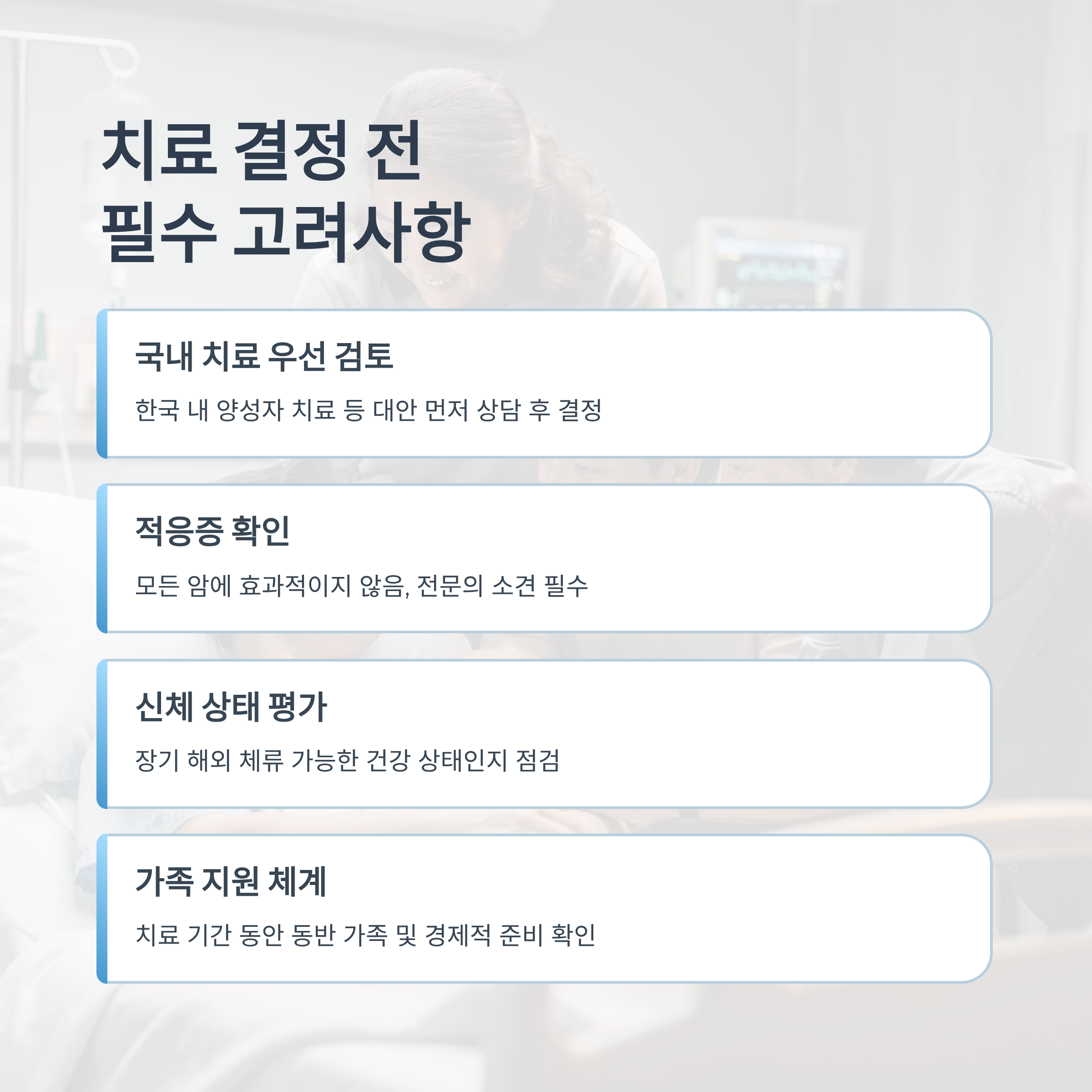 - 환자의 건강 상태 및 체력: 장기간 해외에 체류하며 치료를 받는 것은 상당한 체력을 요구합니다. 환자가 장거리 이동과 낯선 환경에서의 생활을 감당할 수 있는 건강 상태인지 객관적으로 판단해야 합니다.