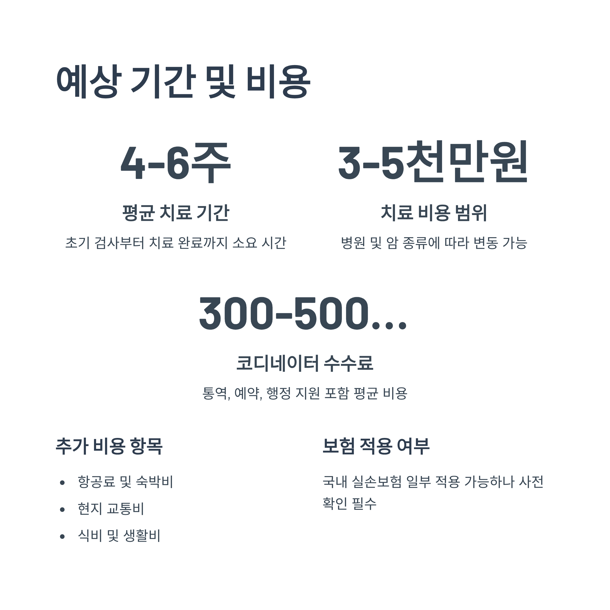 - 사전 준비 기간 (국내): 의료 기록 준비, 병원 선정, 비자 발급 등 약 1~2개월 이상 소요될 수 있습니다.