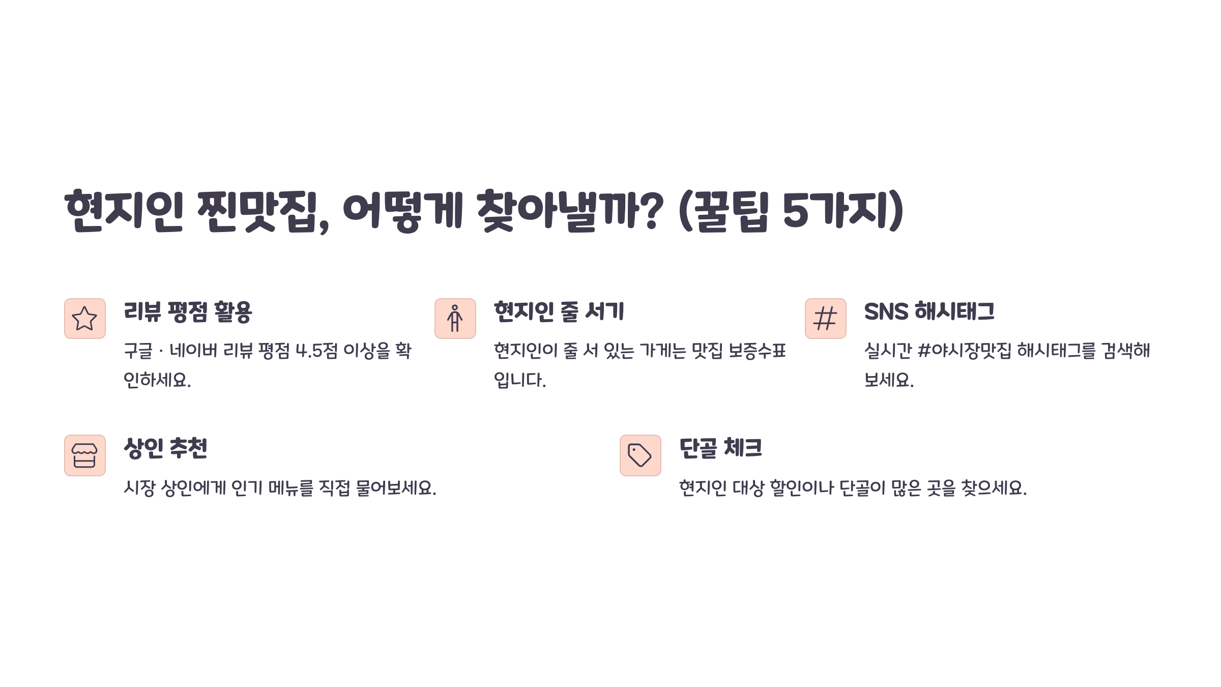 이 글에서 알려드린 팁들을 참고 삼아, 여러분만의 기준으로 현지인 맛집을 찾아내는 재미를 느껴보세요. 활기찬 야시장의 밤, 맛있는 음식과 함께 잊지 못할 추억을 가득 만들어 가시길 바랍니다! 😊