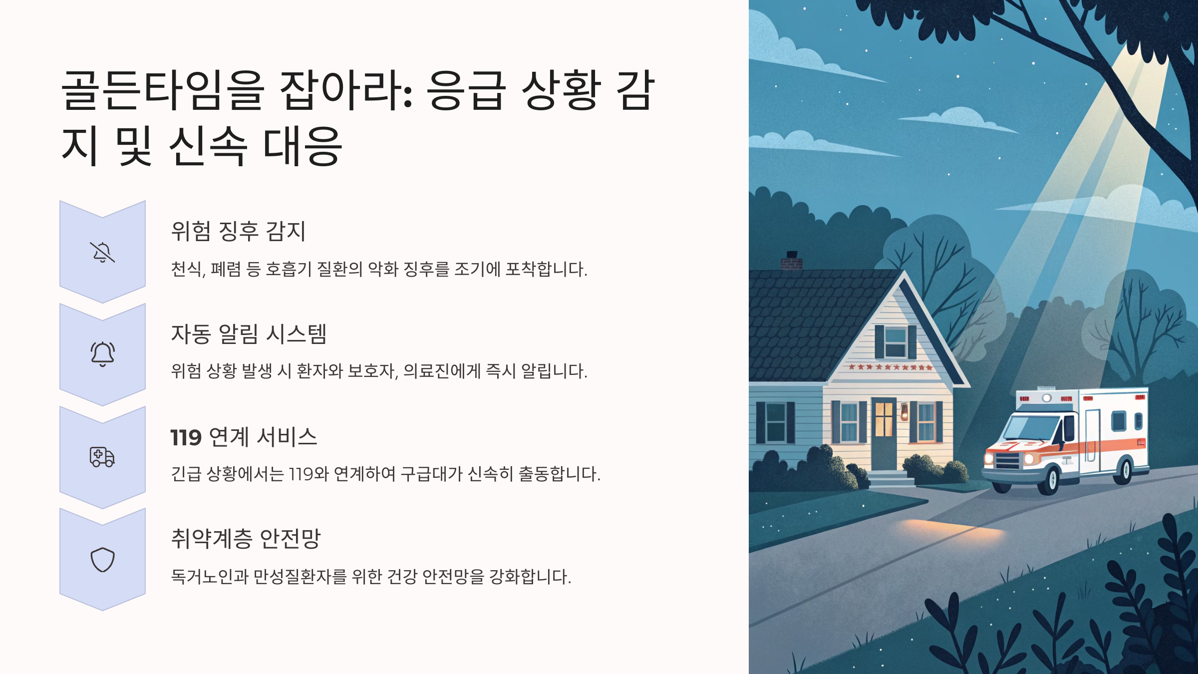 수면 중 무호흡이나 심장마비 전조 증상과 같이 급격하고 위험한 호흡 패턴 변화를 실시간으로 감지하여, 사용자 본인이나 보호자, 또는 응급 구조기관에 자동으로 알림을 보내 신속하게 대처할 수 있도록 도울 수 있습니다. 이는 생명을 구하는 데 결정적인 역할을 할 수 있습니다.