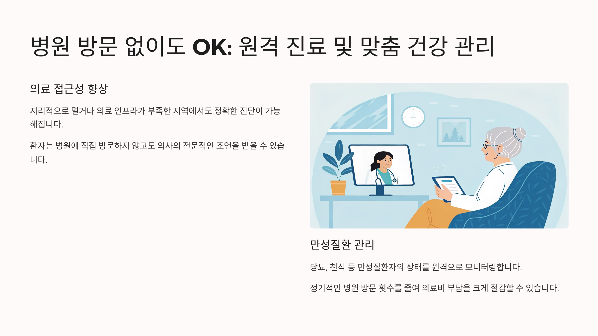 - 의료 접근성 향상 및 격차 해소: 시간과 장소에 구애받지 않고 건강 상태를 점검하고 관리할 수 있게 되어, 의료 서비스 접근이 어려운 지역이나 계층에게도 큰 도움이 될 것입니다.