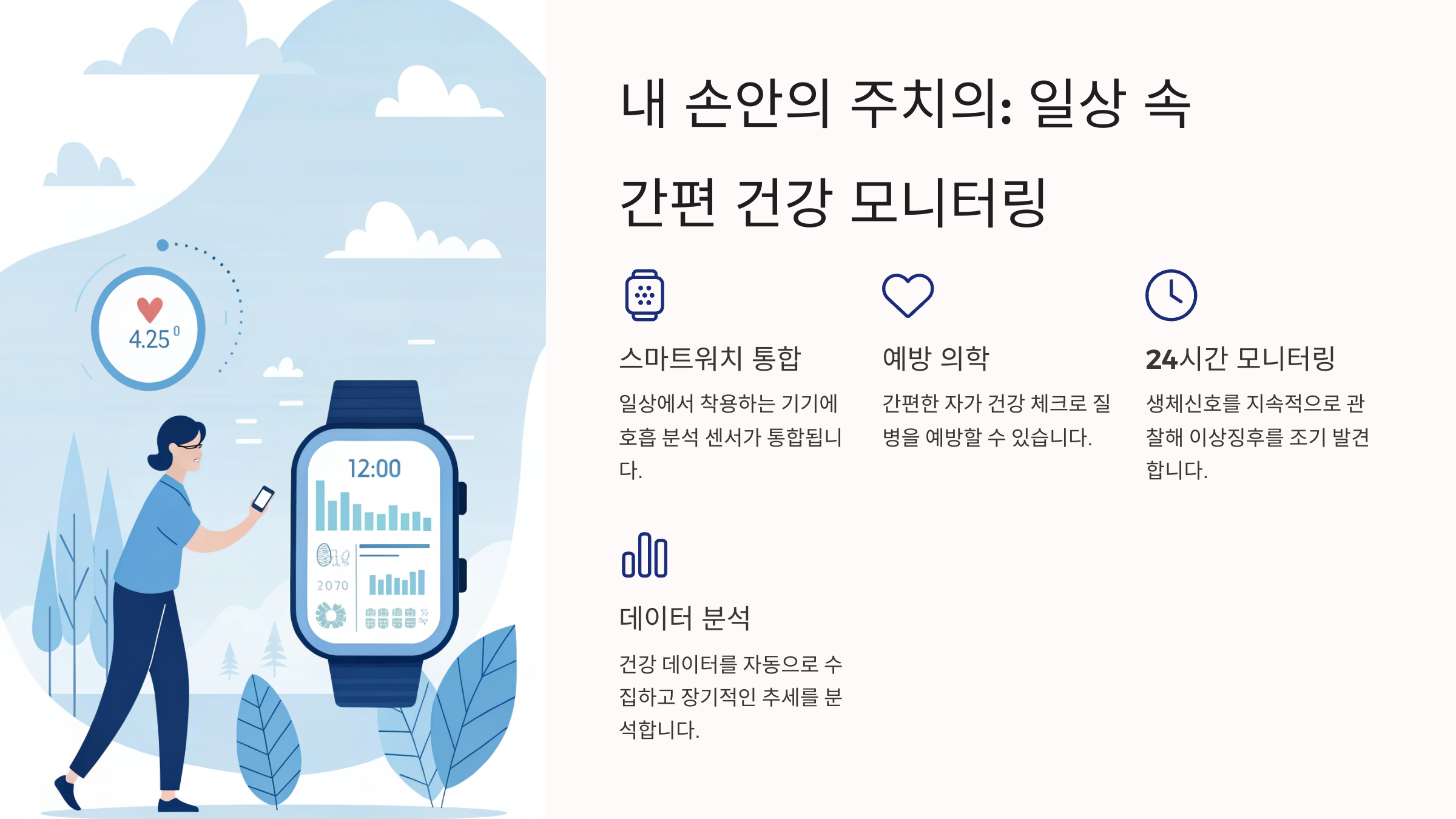 - 첨단 센서 및 AI 알고리즘 활용: 미세한 호흡 변화나 극미량의 가스 성분을 감지하기 위한 첨단 센서 기술과, 수집된 방대한 데이터를 분석하여 의미 있는 건강 정보로 변환하는 정교한 AI 알고리즘이 핵심 기술이 될 것입니다.