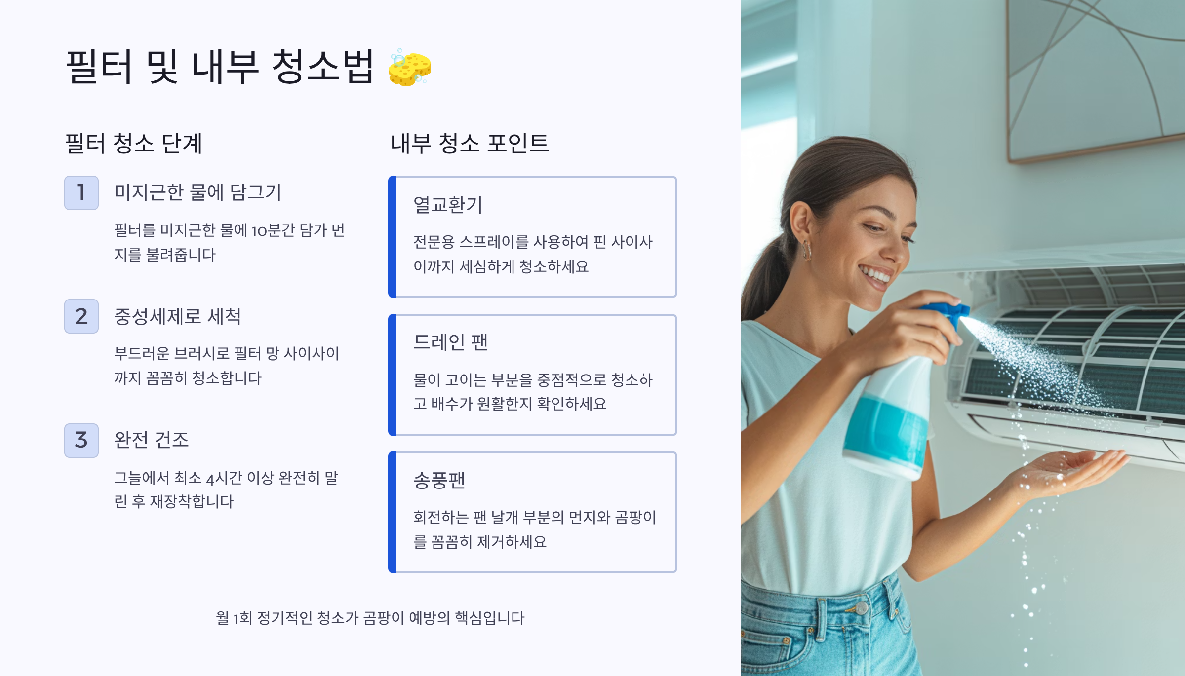 다음 섹션에서는 '곰팡이가 가장 잘 자라는 곳', 즉 필터와 열교환기 청소 방법을 더 자세히 알아볼게요. 🧽 필터 청소는 에어컨 관리의 기본 중 기본이에요!