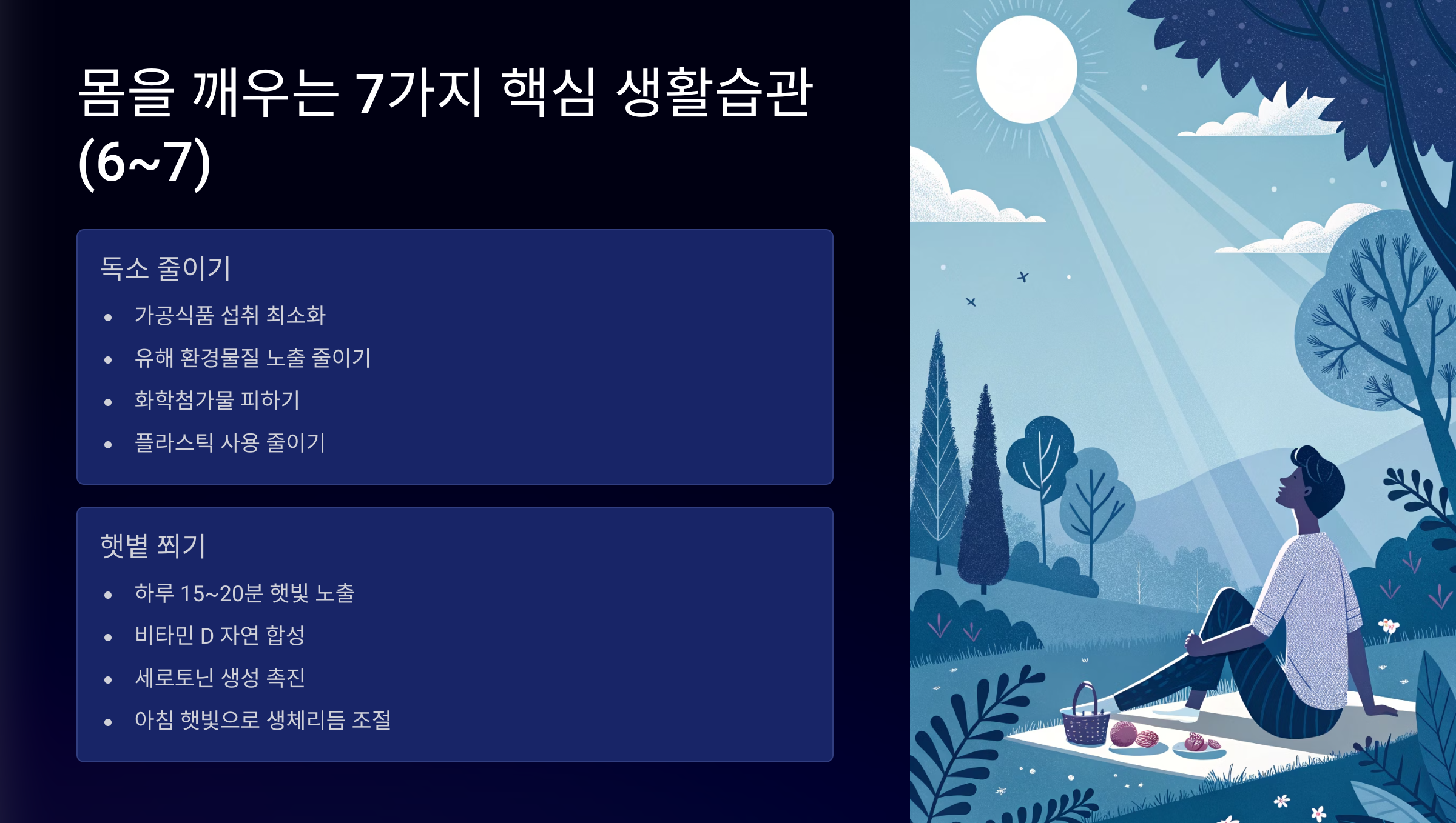 우리 몸은 끊임없이 외부 독소(미세먼지, 환경호르몬, 화학물질 등)와 내부 독소(대사 과정에서 생기는 노폐물)에 노출됩니다. 가공식품, 인스턴트식품, 과도한 설탕 섭취를 줄이고, 금연과 절주를 실천하며, 몸의 해독 작용을 돕는 것이 중요합니다. 깨끗한 물을 충분히 마시는 것도 해독에 큰 도움이 됩니다.