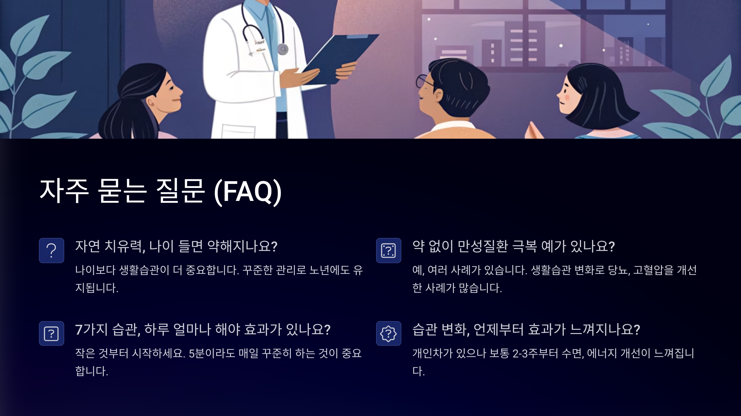 A1. 자연 치유력은 질병 예방과 회복에 큰 도움이 되지만, 만능은 아닙니다. 심각한 질병이나 응급 상황 시에는 반드시 전문가의 진단과 치료가 필요합니다. 자연 치유력 향상은 현대 의학과 함께 갈 때 시너지 효과를 낼 수 있습니다.