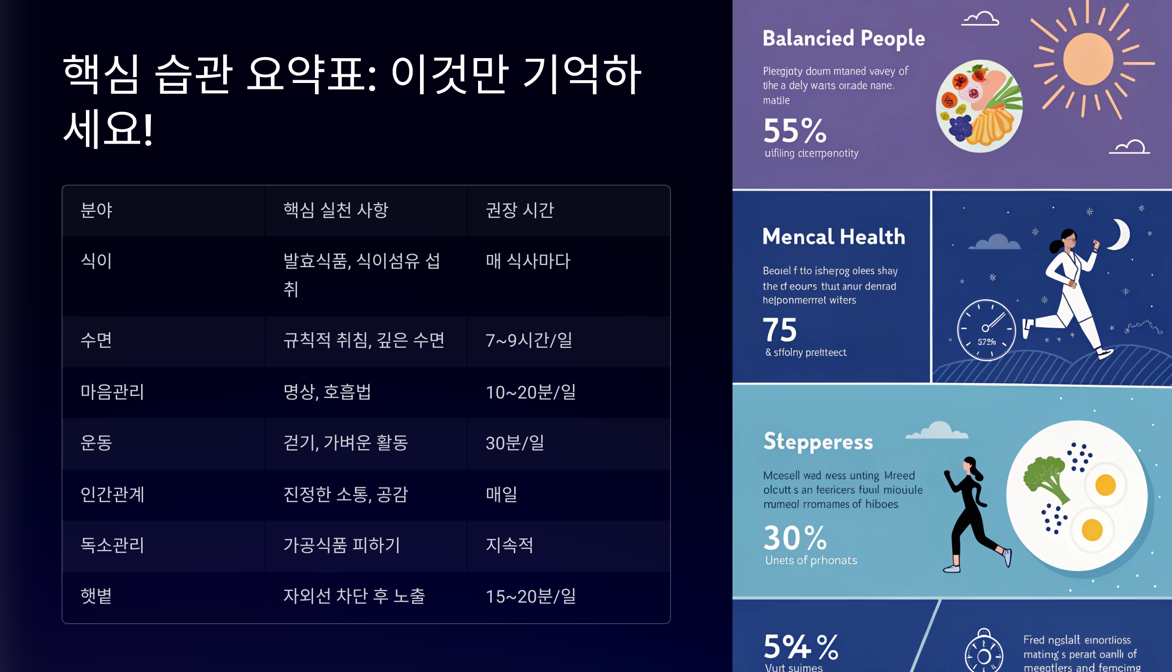 위에 제시된 7가지 습관을 한꺼번에 다 실천하려고 하면 부담스러울 수 있습니다. 완벽하게 하려고 하기보다, 오늘 당장 시작할 수 있는 작은 습관 한두 가지를 정해 꾸준히 실천하는 것이 훨씬 효과적입니다. 예를 들어, '매일 물 8잔 마시기'나 '저녁 식사 후 10분 산책하기'처럼 말이죠.