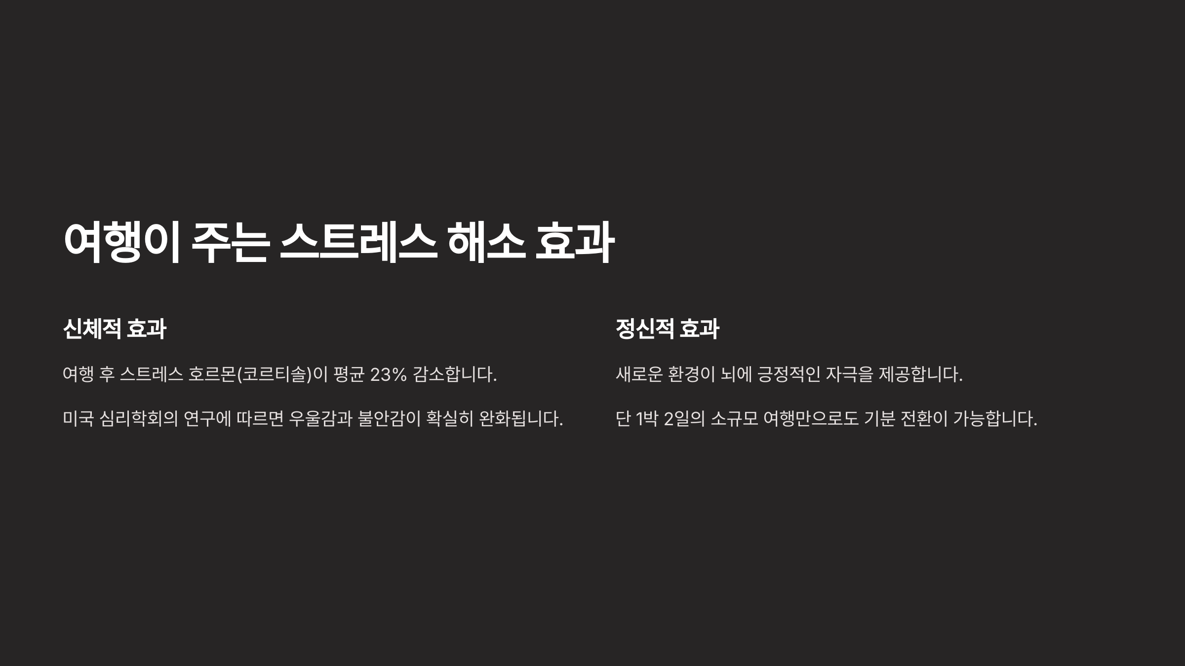 ‘여행이 뭐 그렇게 대단해?’ 하던 저도, 직접 겪고 나니 180도 생각이 달라졌어요✨. 새로운 풍경, 새로운 사람들, 낯선 공기. 이 모든 게 제 안에 쌓였던 스트레스를 풀어주는 열쇠가 되더라고요. 실제로 심리학 연구에서도 여행은 스트레스 호르몬을 낮추고 행복 호르몬을 높인다고 합니다. 진짜 과학적으로도 인정받은 힐링 방법이에요!