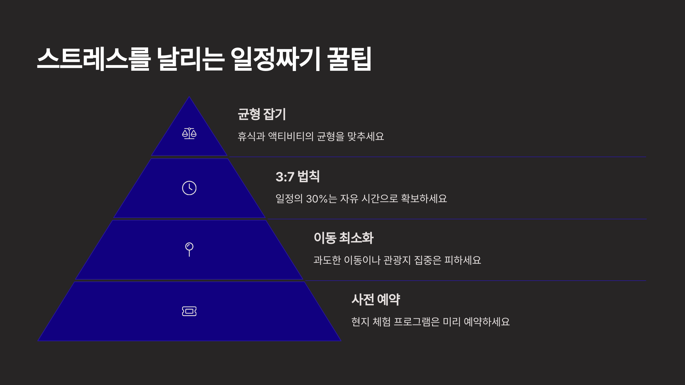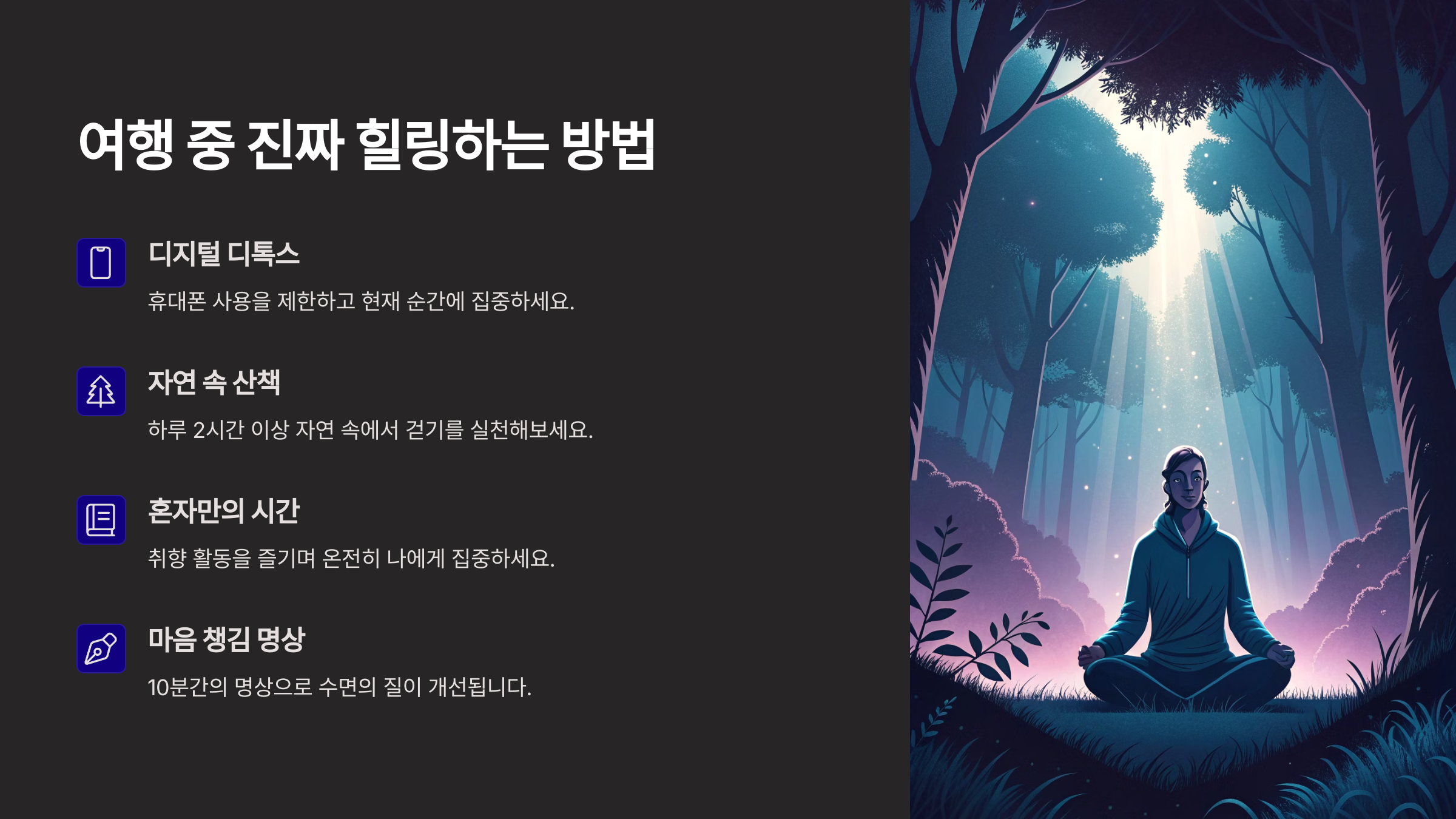여행한다고 무조건 힐링되는 건 아니더라고요😅. 저만 해도 처음에는 ‘빡센’ 스케줄에 오히려 더 지쳤던 기억이 있어요. 진짜 힐링하려면: