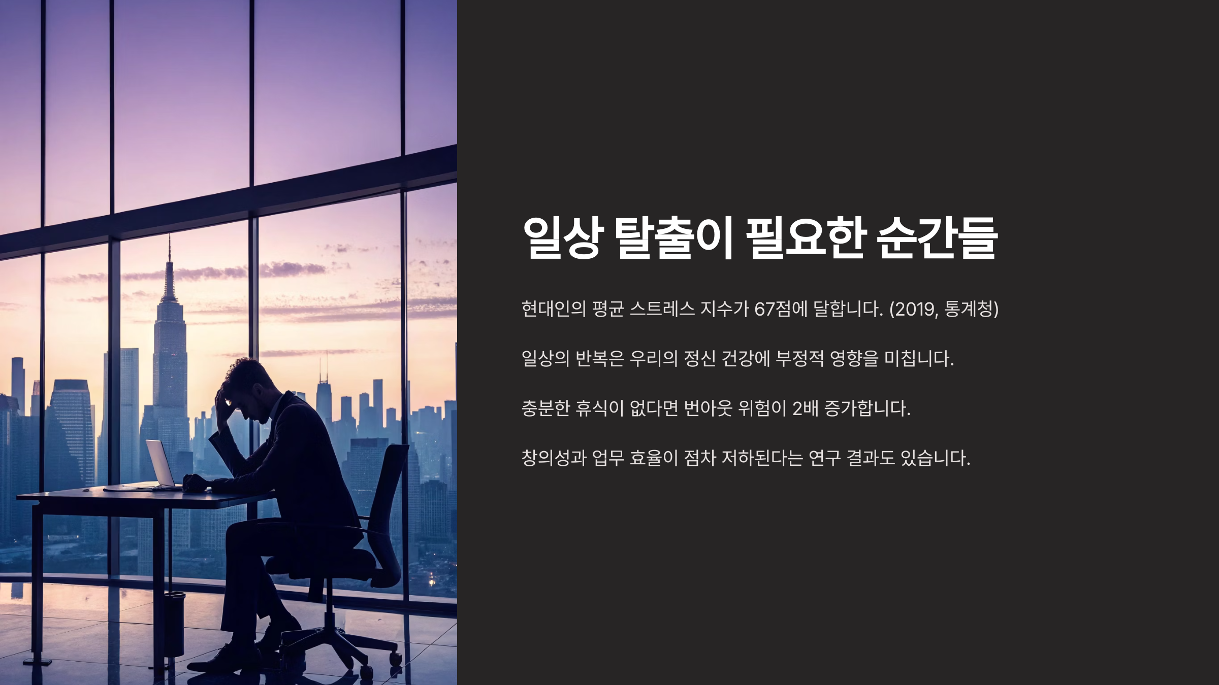 요즘 다들 지치고 힘드시죠? 저도 그랬습니다😥. 매일 똑같은 일상에 갇혀있다 보면 어느새 웃음도, 여유도 사라지더라고요. 그래서 저는 ‘일상 탈출’이 정말 필요하다고 느꼈습니다. 몸이 아니라 마음이 먼저 무너지는 걸 막으려면 가끔은 낯선 곳으로 훌쩍 떠나야 해요. 그렇게 해야 다시 제자리를 찾아올 힘을 얻을 수 있거든요.