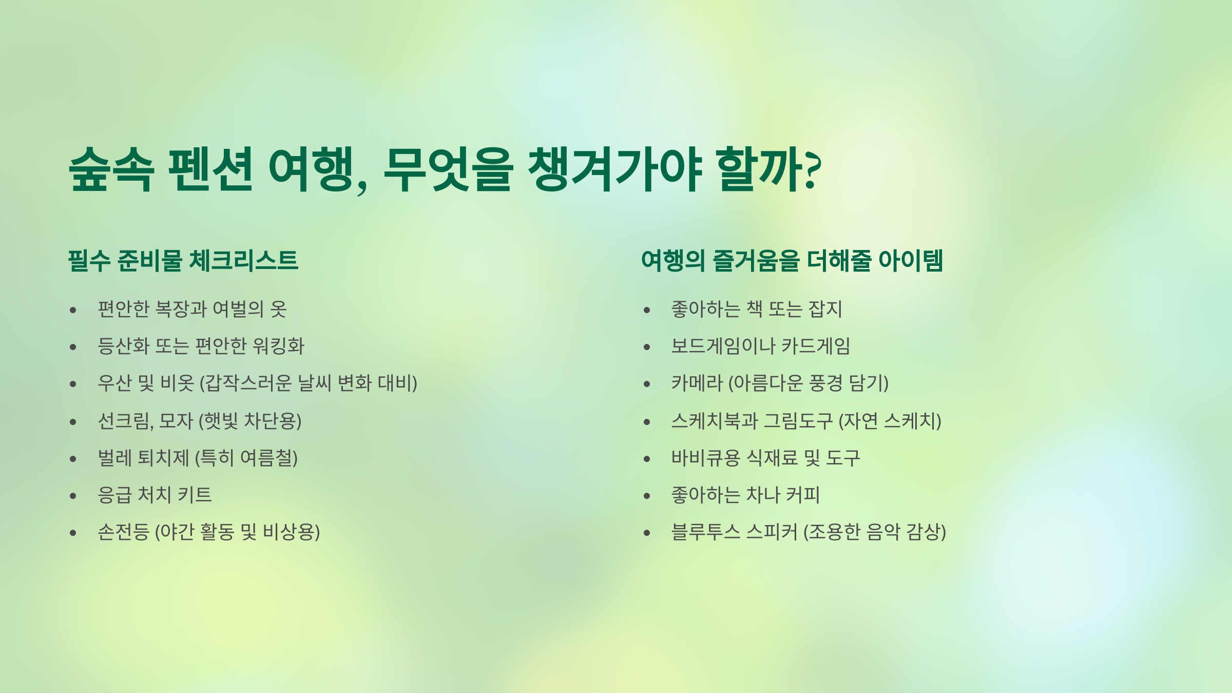 숲속 펜션 여행, 무엇을 챙겨가야 할까? (준비물 체크리스트) 🎒