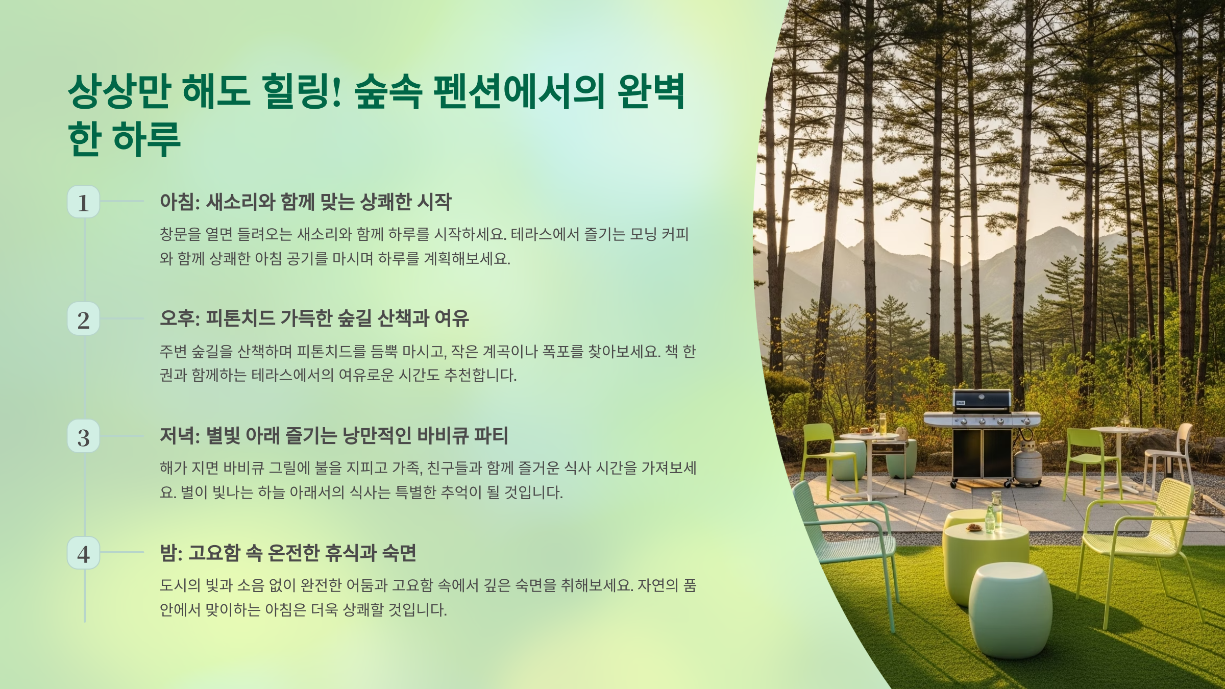 숲속 펜션에서의 하루를 더욱 풍요롭게 만들어 줄 시간대별 힐링 플랜을 제안합니다. (이는 저의 실제 경험을 바탕으로 한 추천입니다 - E-E-A-T)