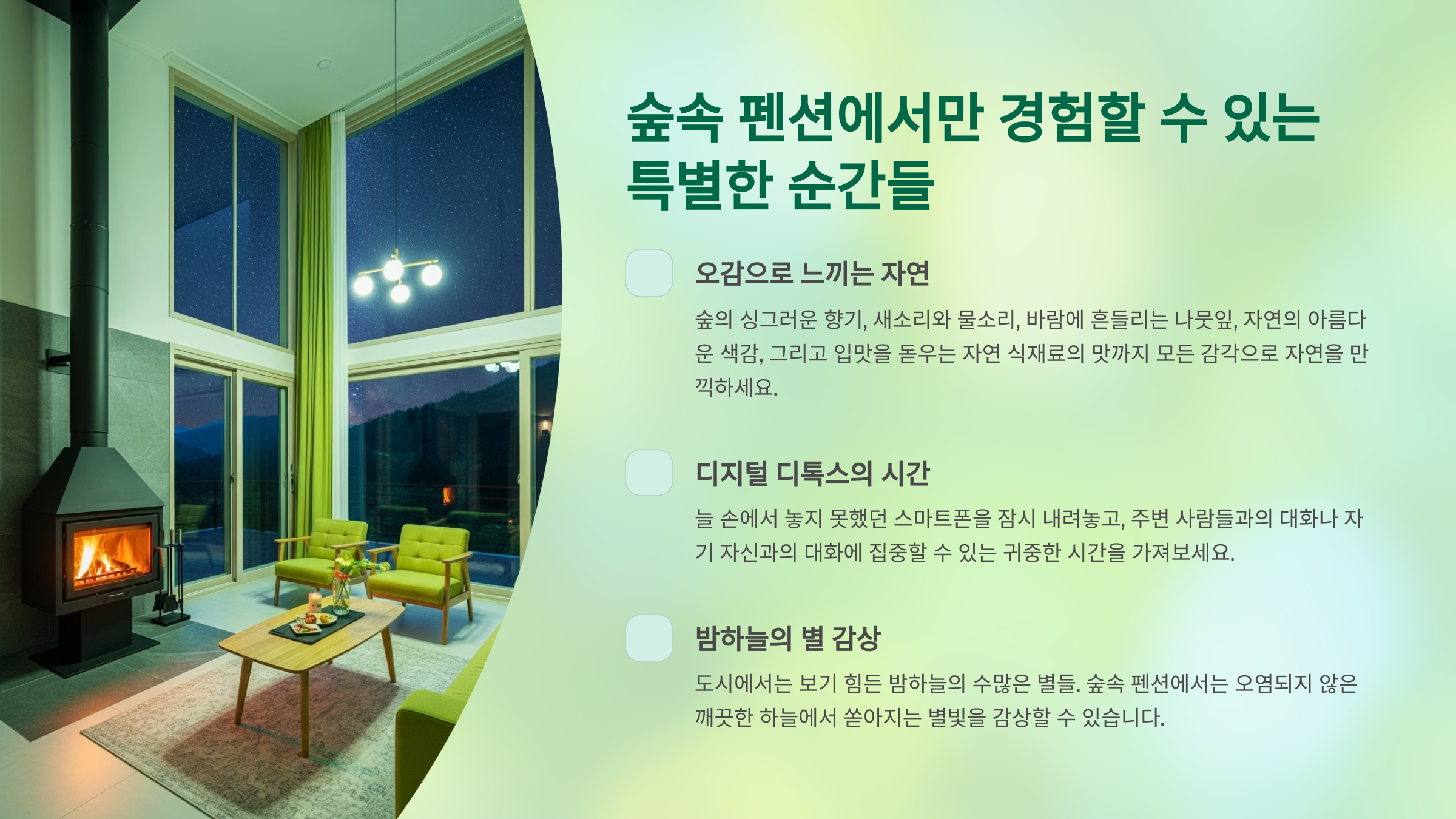 숲속 펜션은 화려한 호텔이나 북적이는 관광지의 숙소와는 다른 매력을 가지고 있습니다. 인위적인 소음 대신 바람에 나뭇잎 스치는 소리, 새들의 지저귐, 밤벌레 소리가 그 자리를 채웁니다. 복잡한 도심에서 벗어나 자연의 품에 안기는 것만으로도 우리는 일상의 스트레스와 긴장에서 한 걸음 멀어질 수 있습니다.
