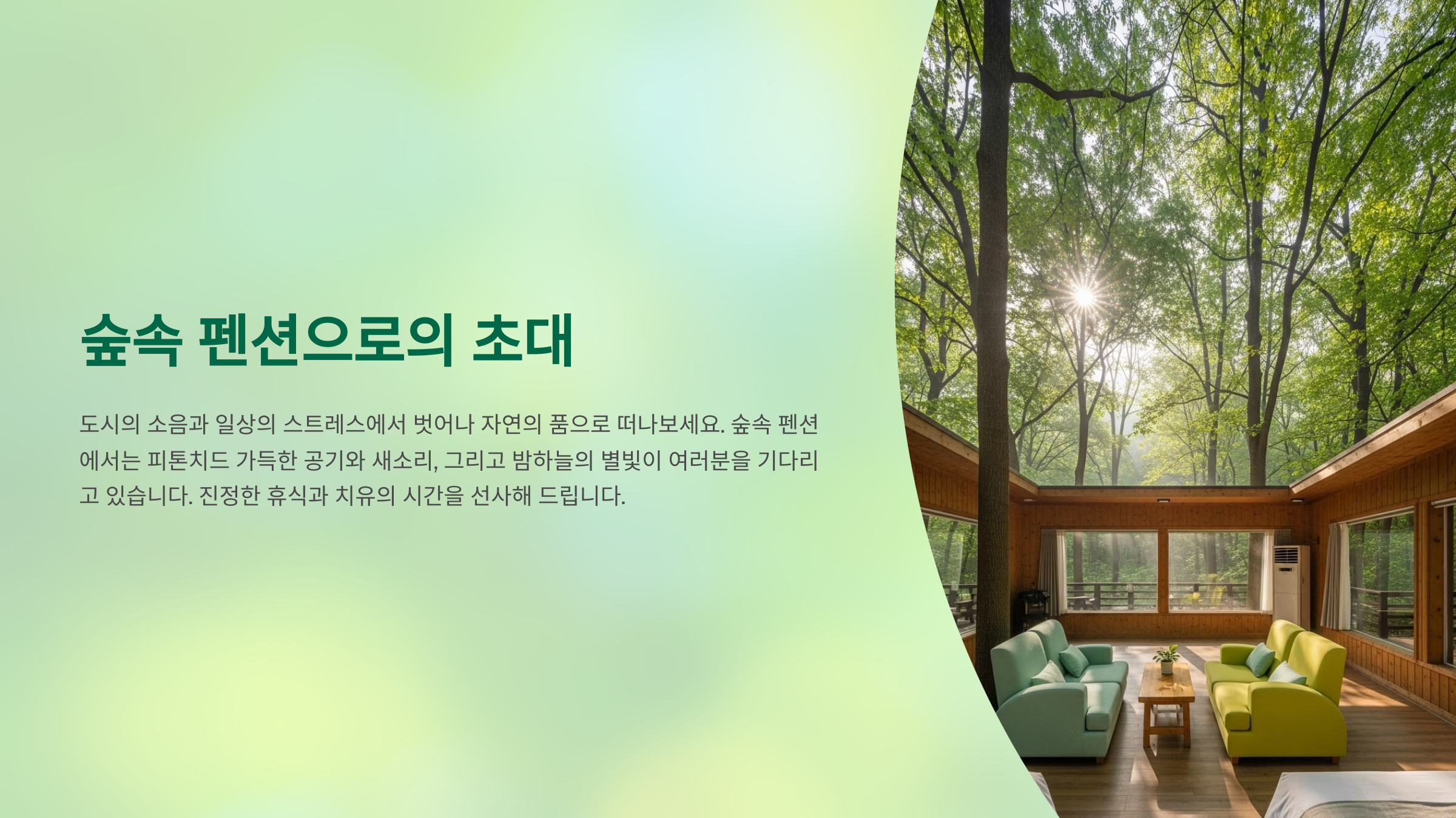 숲속 펜션에서의 하루는 단순한 여행을 넘어, 자연의 품 안에서 나 자신을 돌아보고 재충전하는 소중한 시간입니다. 복잡한 생각과 스트레스는 잠시 내려놓고, 자연이 주는 순수한 위로와 평화를 온전히 느껴보세요.