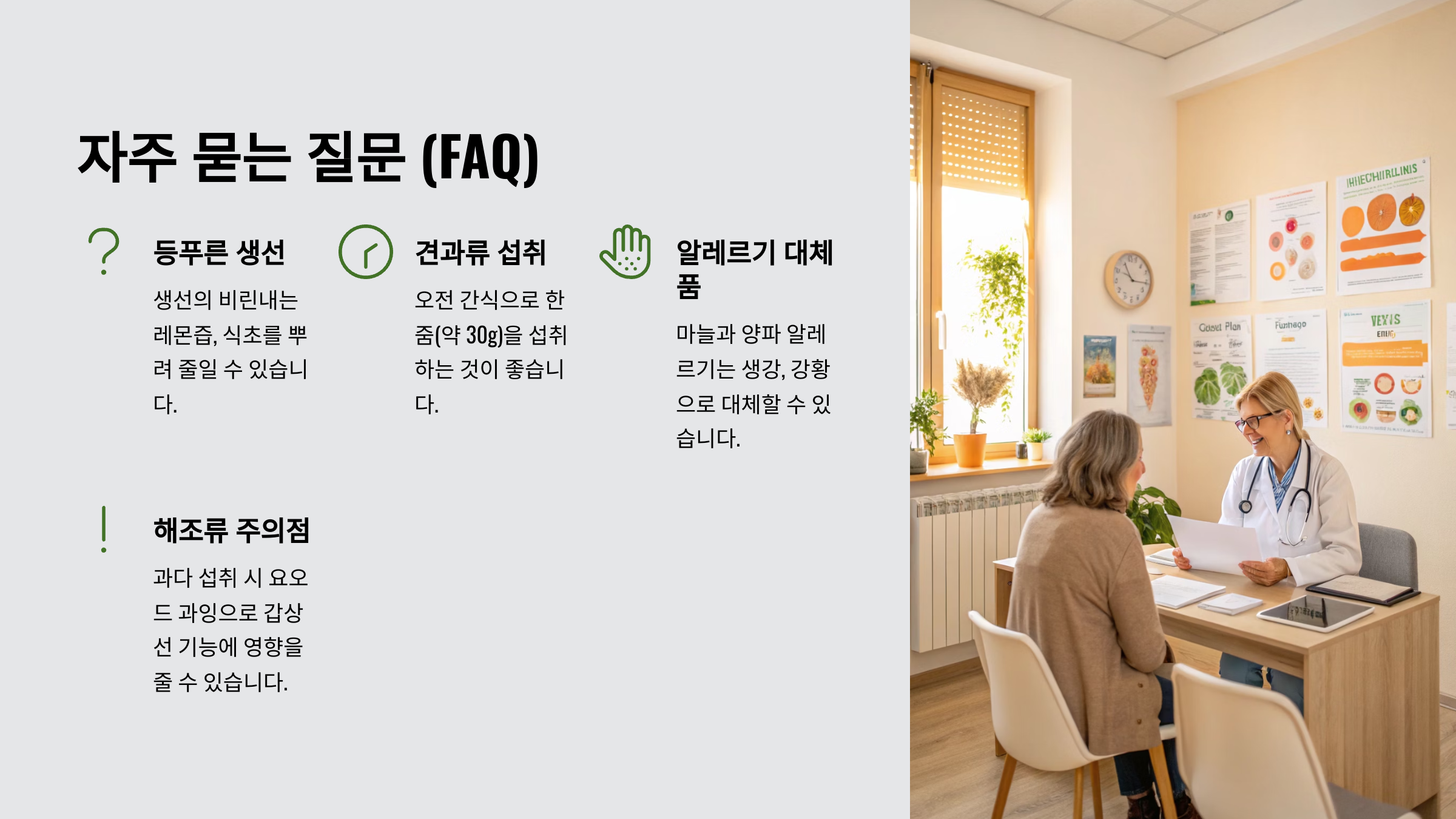 A3. 각 음식의 '주의사항' 부분을 참고하시고, 특정 질환이 있거나 약물을 복용 중인 경우(예: 항응고제, 갑상선 질환 약 등)에는 섭취 전 반드시 의사 또는 약사와 상담하는 것이 안전합니다. 또한, 아무리 좋은 음식이라도 과다 섭취는 피하고 적정량을 지키는 것이 중요합니다.