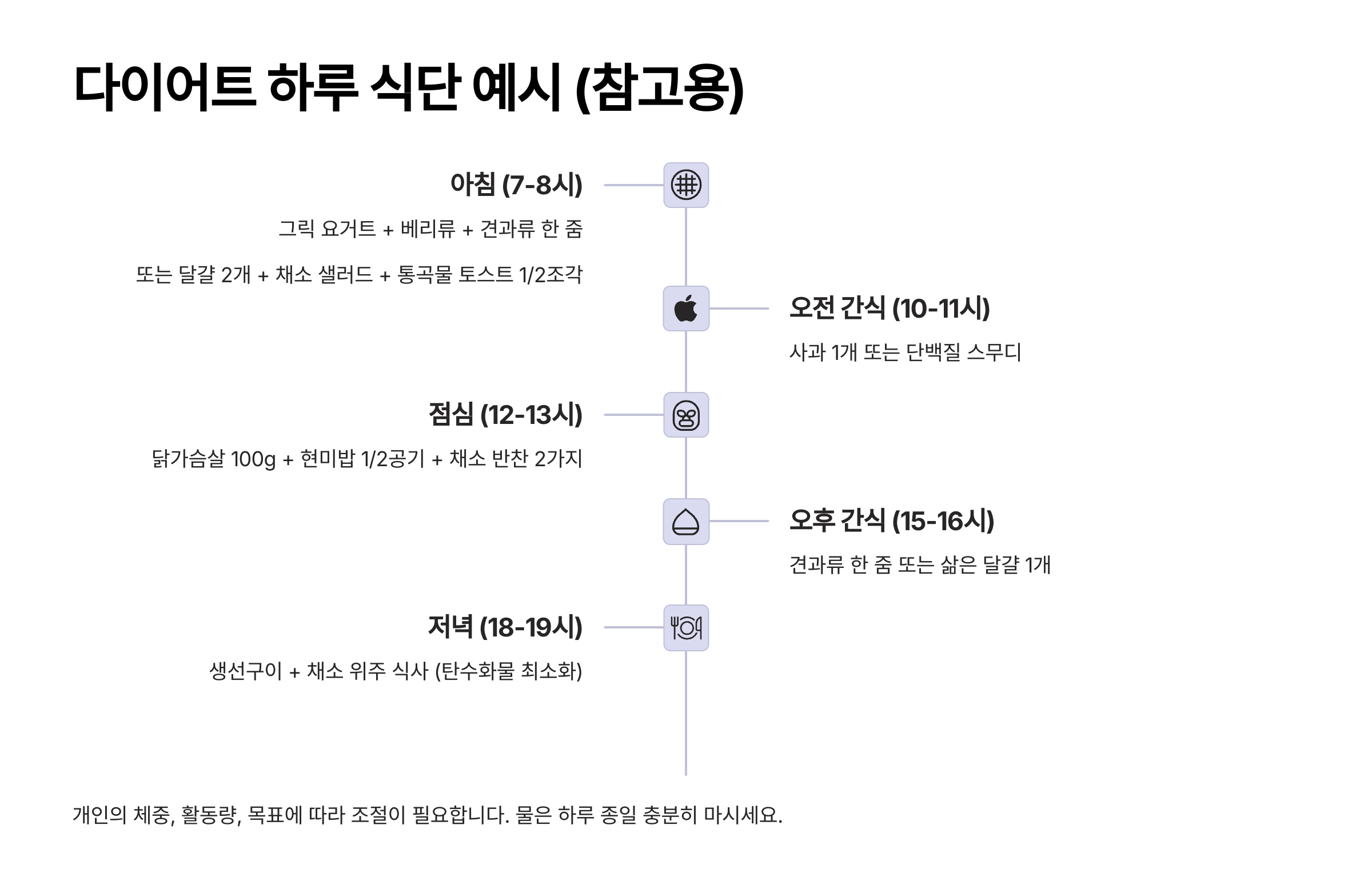 앞서 소개한 다이어트에 좋은 식품과 피해야 할 식품을 바탕으로, 건강한 다이어트를 위한 하루 식단 예시를 구성해 보았습니다. 이는 개인의 기초대사량, 활동량, 목표에 따라 양과 종류가 달라져야 하므로 참고용으로만 활용하시고, 자신에게 맞게 조절하세요.