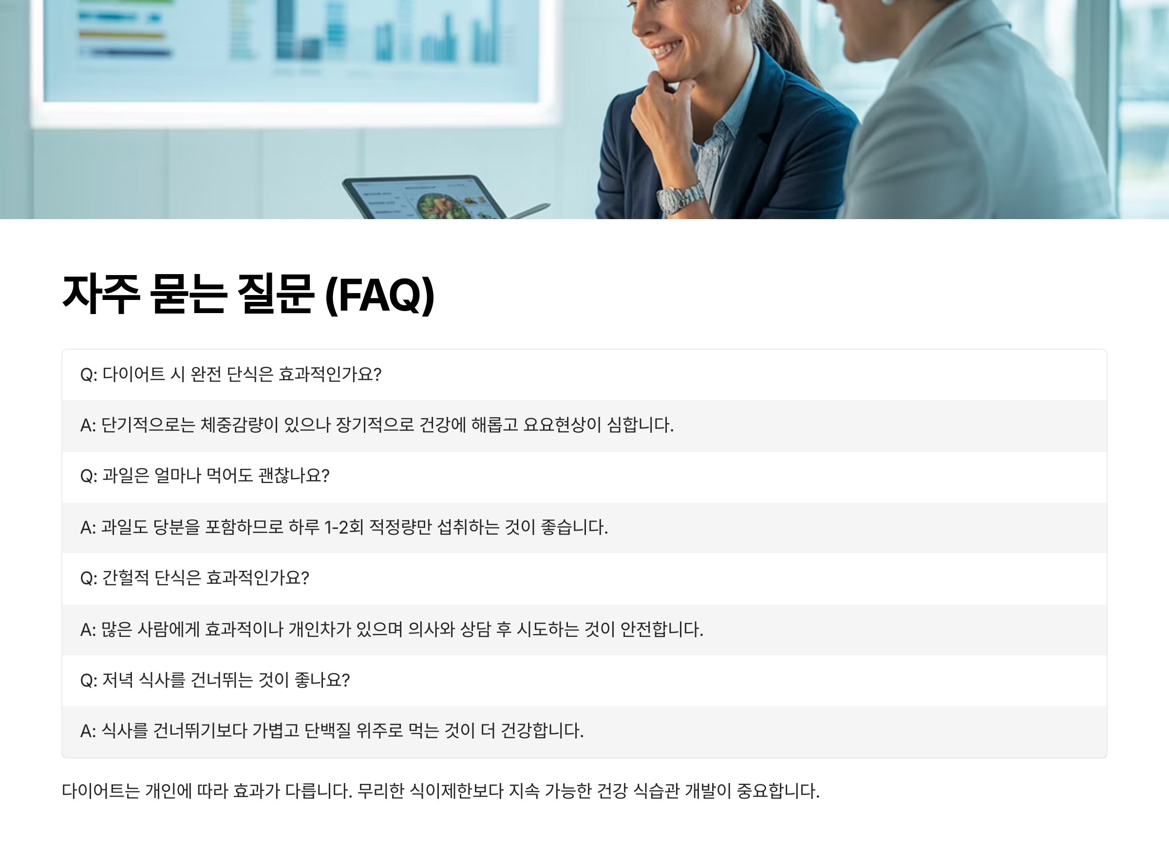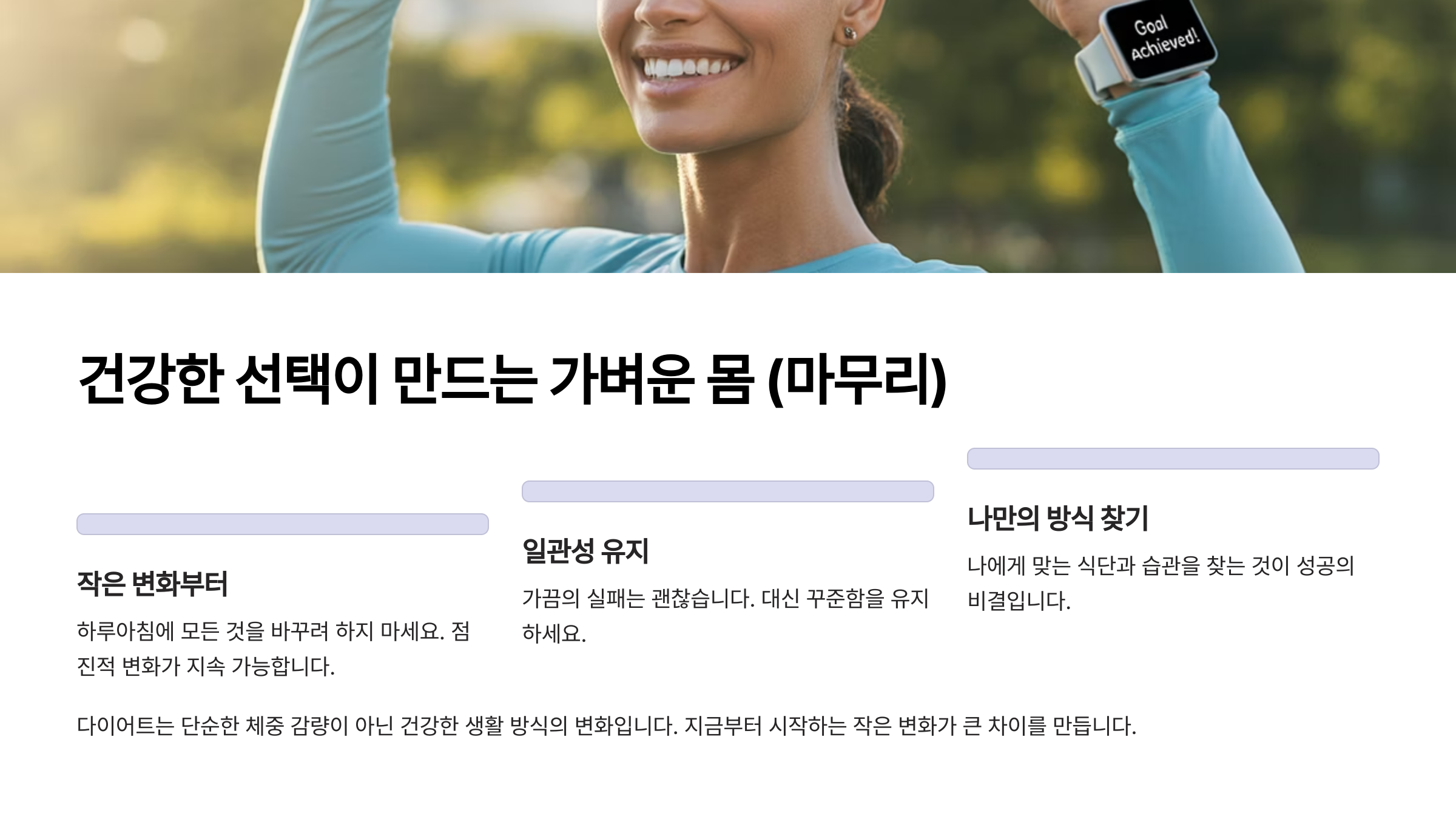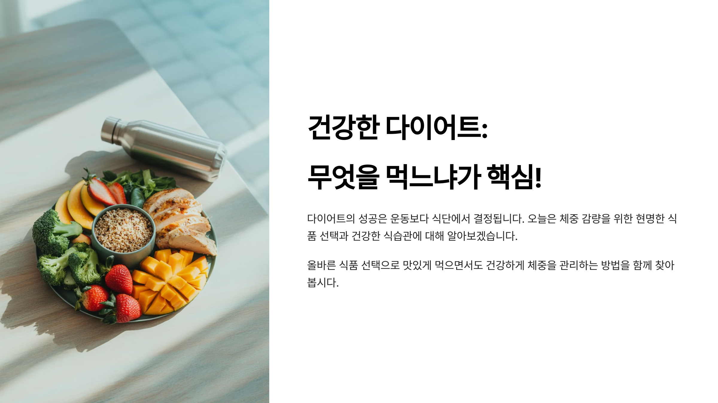 오늘부터 식탁 위 작은 선택 하나하나에 조금 더 신경 써보세요. 그 작은 변화들이 모여 건강하고 가벼운 몸, 그리고 더 활기찬 삶을 선물할 것입니다. 여러분의 성공적인 다이어트와 건강한 라이프스타일을 응원합니다!