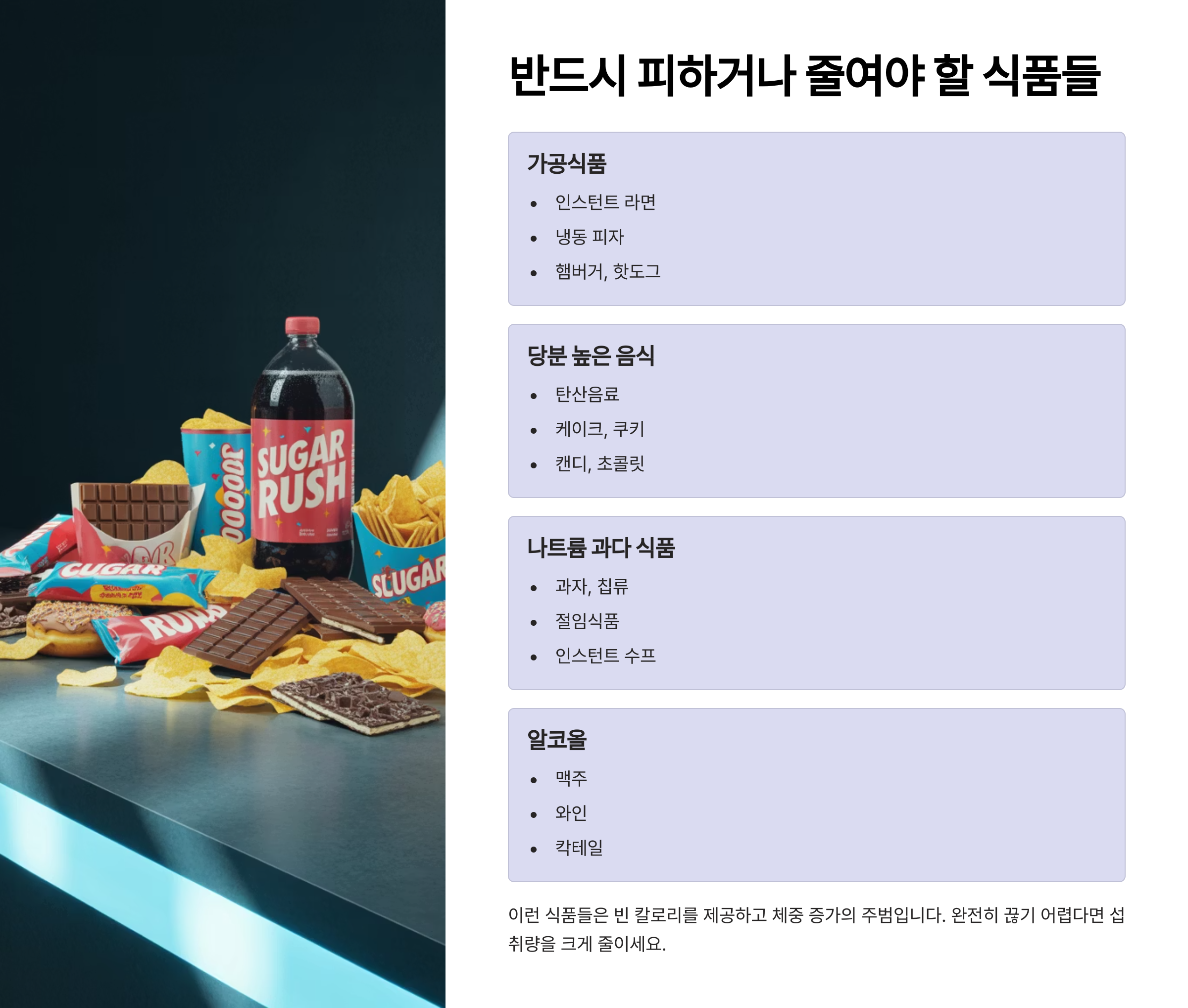 - 🚫 가공식품 및 첨가당 줄이기: 칼로리는 높고 영양가는 낮은 과자, 탄산음료, 가공식품, 설탕이 많이 든 음식은 최대한 피하거나 줄입니다.