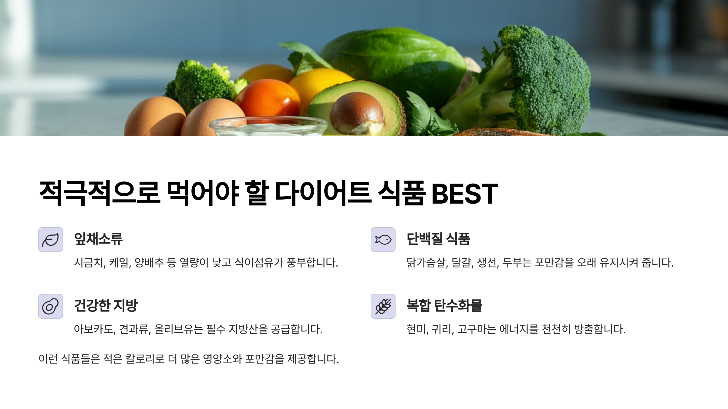 성공적인 다이어트는 단순히 굶거나 칼로리만 계산하는 것이 아닙니다. 우리 몸에 필요한 영양소를 골고루 공급하면서 포만감을 주고, 건강하게 체중을 감량할 수 있도록 '무엇을 먹고, 무엇을 피해야 하는지'를 아는 것이 매우 중요합니다. 현명한 식품 선택은 다이어트의 효과를 높이고 지속 가능성을 더해줍니다.