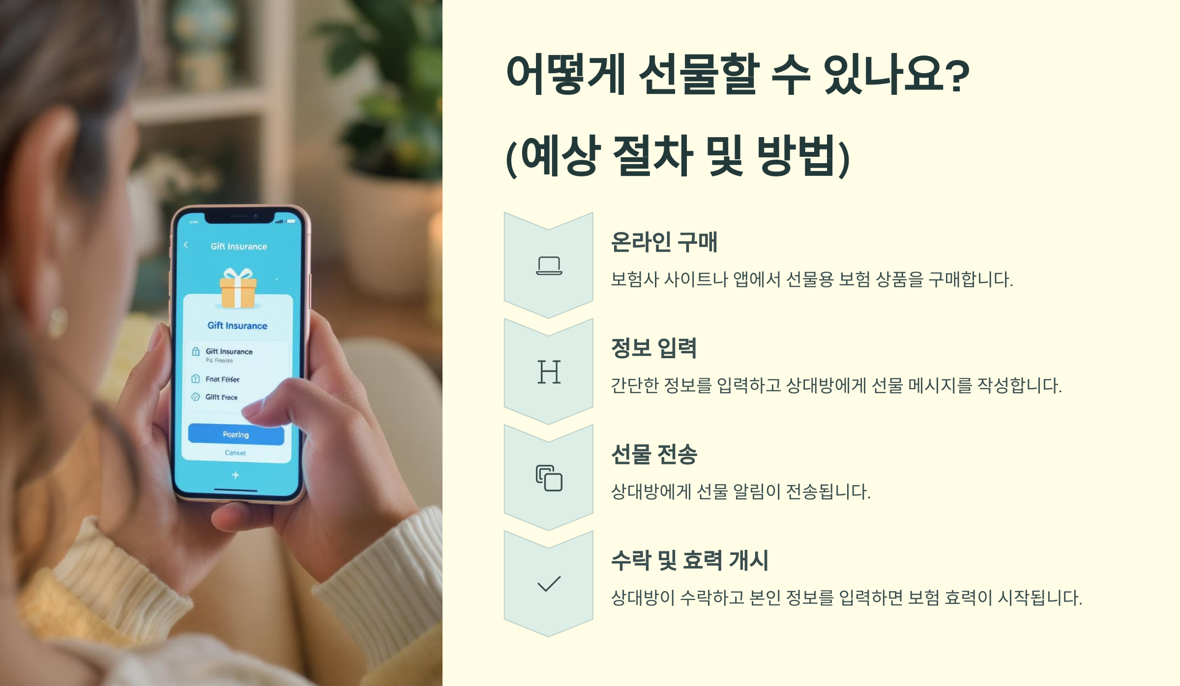 • 선물 받는 사람(피보험자)에게 보험 가입 동의 요청 알림(문자, 이메일 등)이 갈 수 있으며, 피보험자가 최종적으로 동의해야 계약이 완료될 수 있습니다. (또는 사전에 서면 동의서 제출)