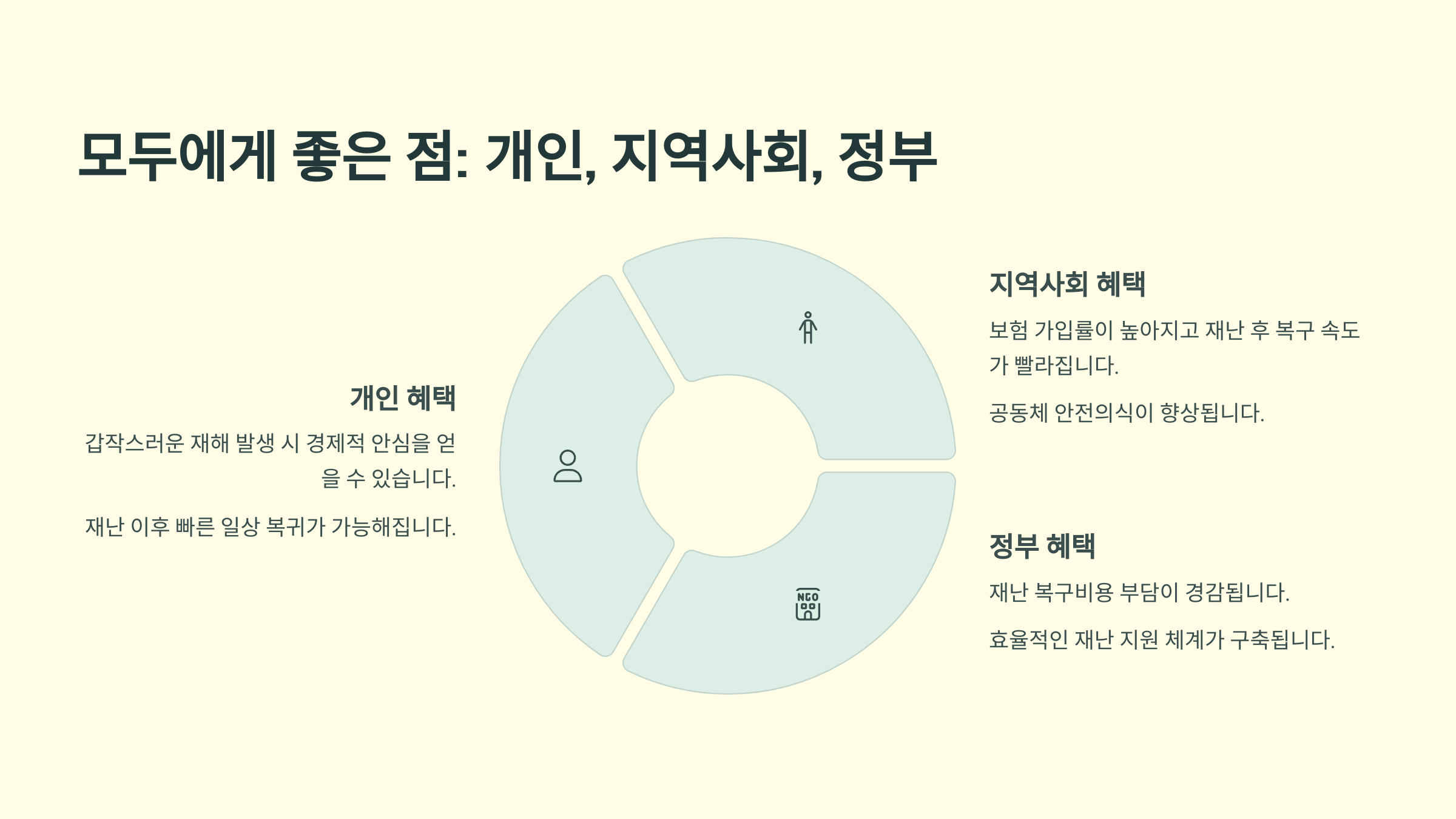 • 재해 복구력 강화: 보험 가입 가구가 늘어날수록 재해 발생 시 지역 사회 전체의 피해 복구 속도와 효율성이 높아질 수 있습니다.