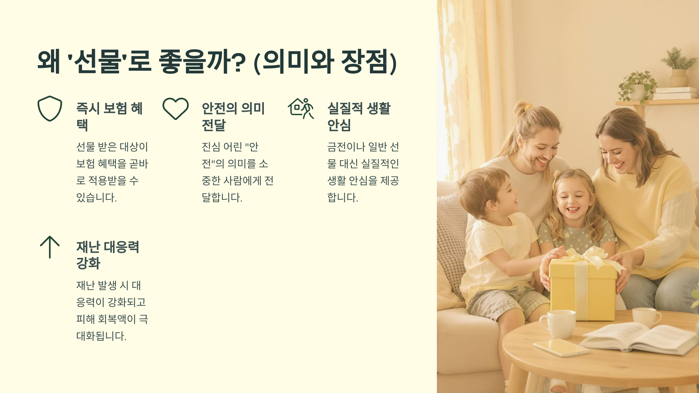 풍수해·지진재해보험을 선물하는 것은 단순한 물질적인 선물을 넘어, 다음과 같은 특별한 의미와 장점을 가집니다.