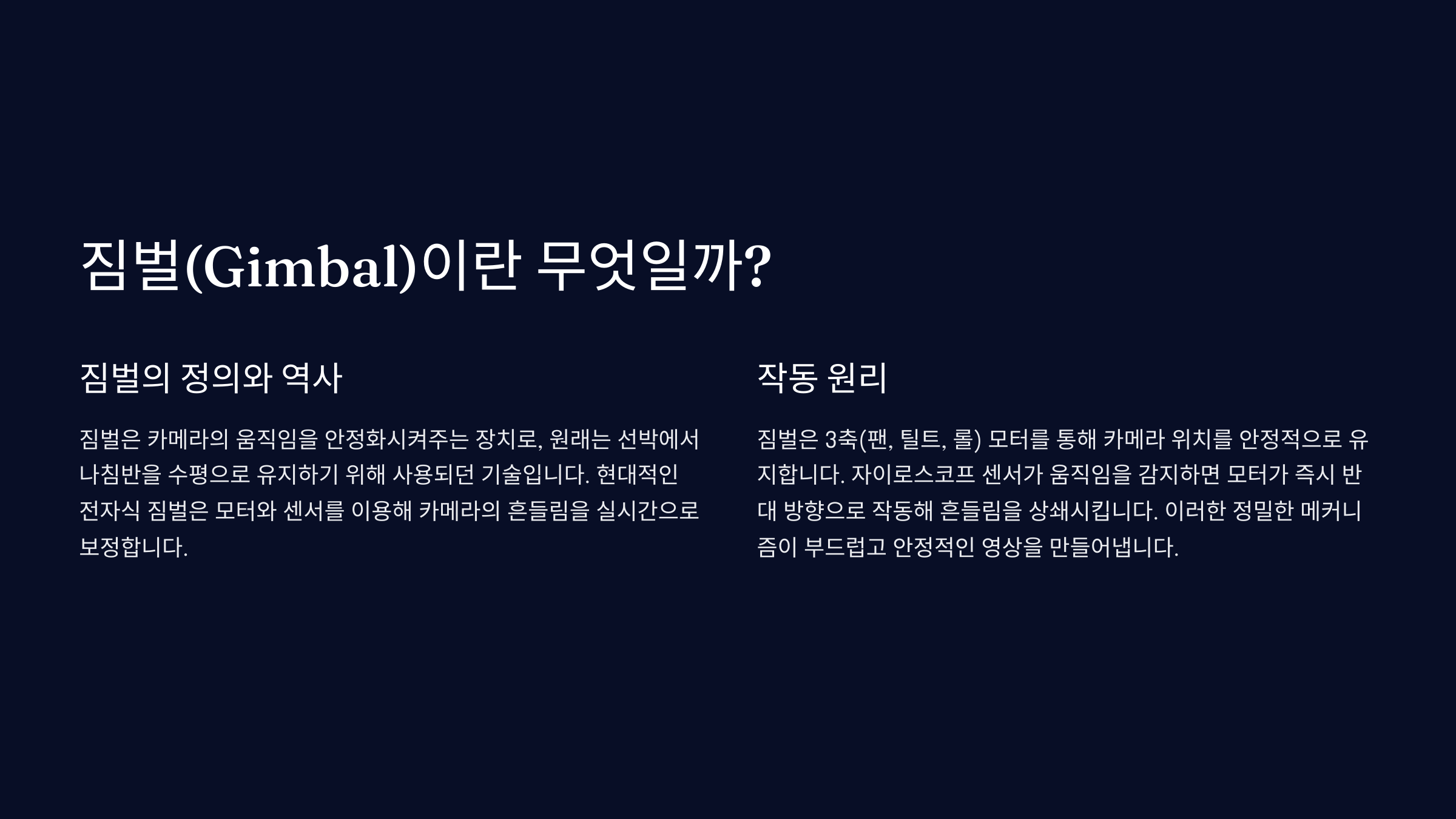 짐벌은 촬영 장비(카메라, 스마트폰 등)가 수평과 수직을 유지하도록 제어하는 장치입니다. 일반적으로 3개의 축(Pan, Tilt, Roll)을 기준으로 작동하며, 각 축에 장착된 모터와 센서가 촬영자의 움직임을 감지하고 그 반대 방향으로 움직여 흔들림을 상쇄시키는 원리입니다.