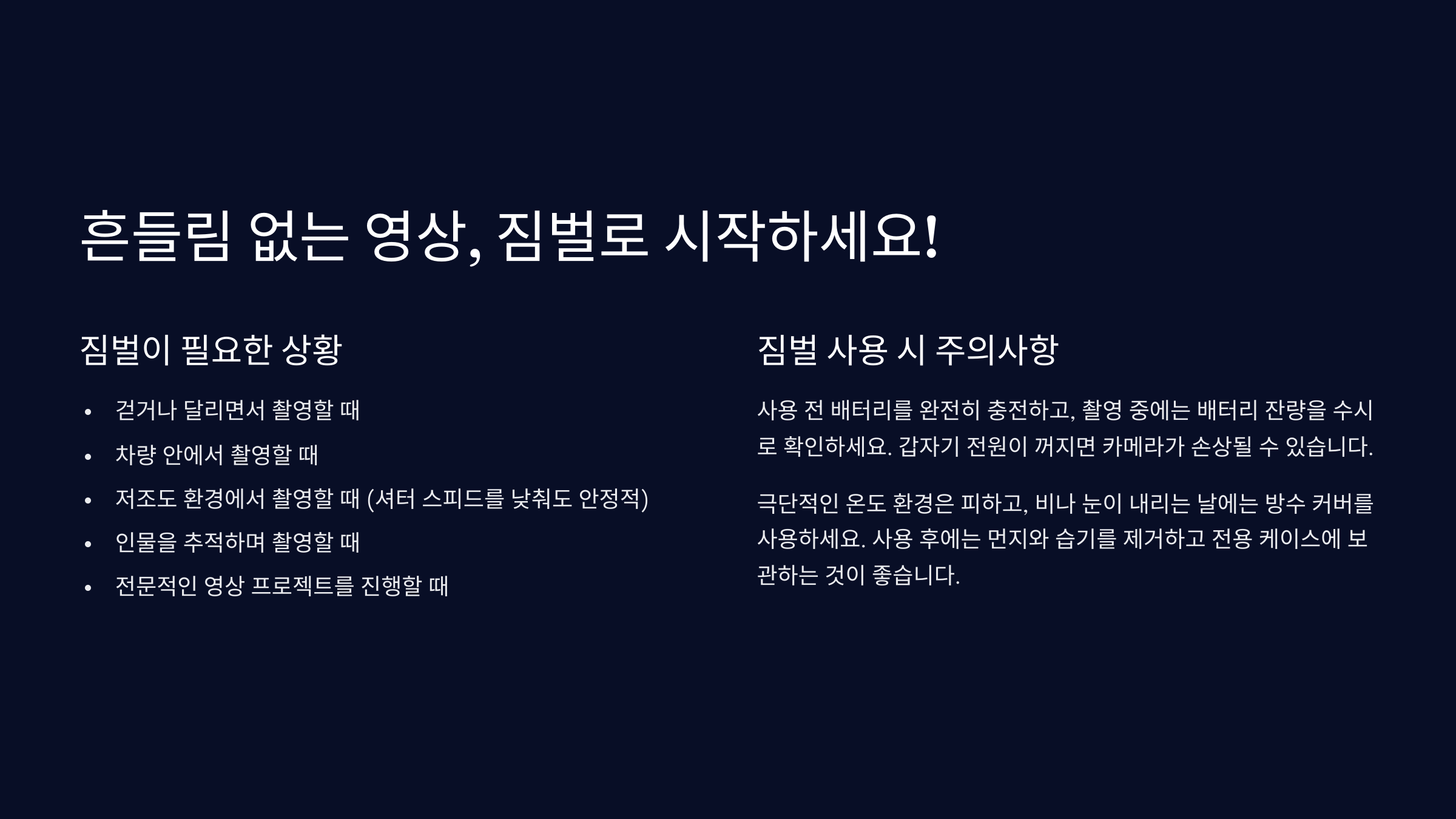 - 압도적인 안정감: 걷거나 뛸 때 발생하는 흔들림을 최소화하여 시청자가 편안하게 볼 수 있는 영상을 만들 수 있습니다.