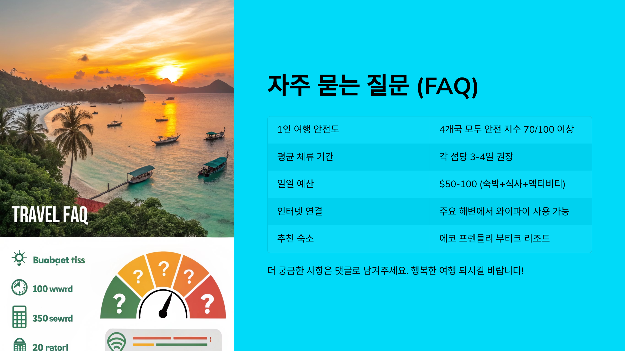 - 팁: 섬 일주에는 스쿠터 렌트가 편리. 현금 준비가 좋으며, 일부 외진 곳은 인터넷 연결이 원활하지 않을 수 있음. 모기 기피제 필수.