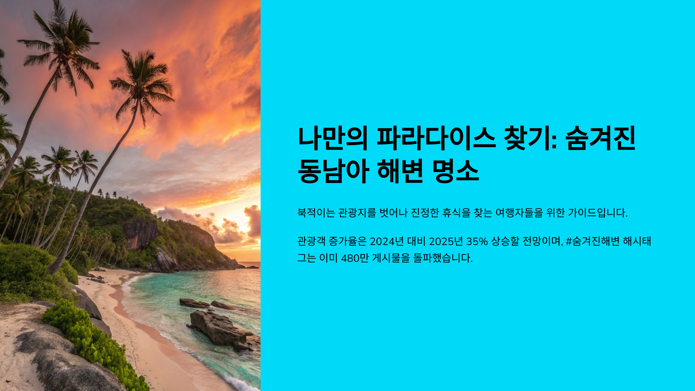 🤫 에메랄드빛 바다, 부드러운 백사장, 잔잔한 파도 소리... 동남아시아는 아름다운 해변으로 가득하지만, 너무 유명해져 버린 관광지는 때로는 인파와 소음으로 진정한 휴식을 방해받기도 합니다. "정말 조용하고 아름다운, 나만 알고 싶은 그런 해변은 없을까?" 하는 생각을 한 번쯤 해보셨을 거예요.
