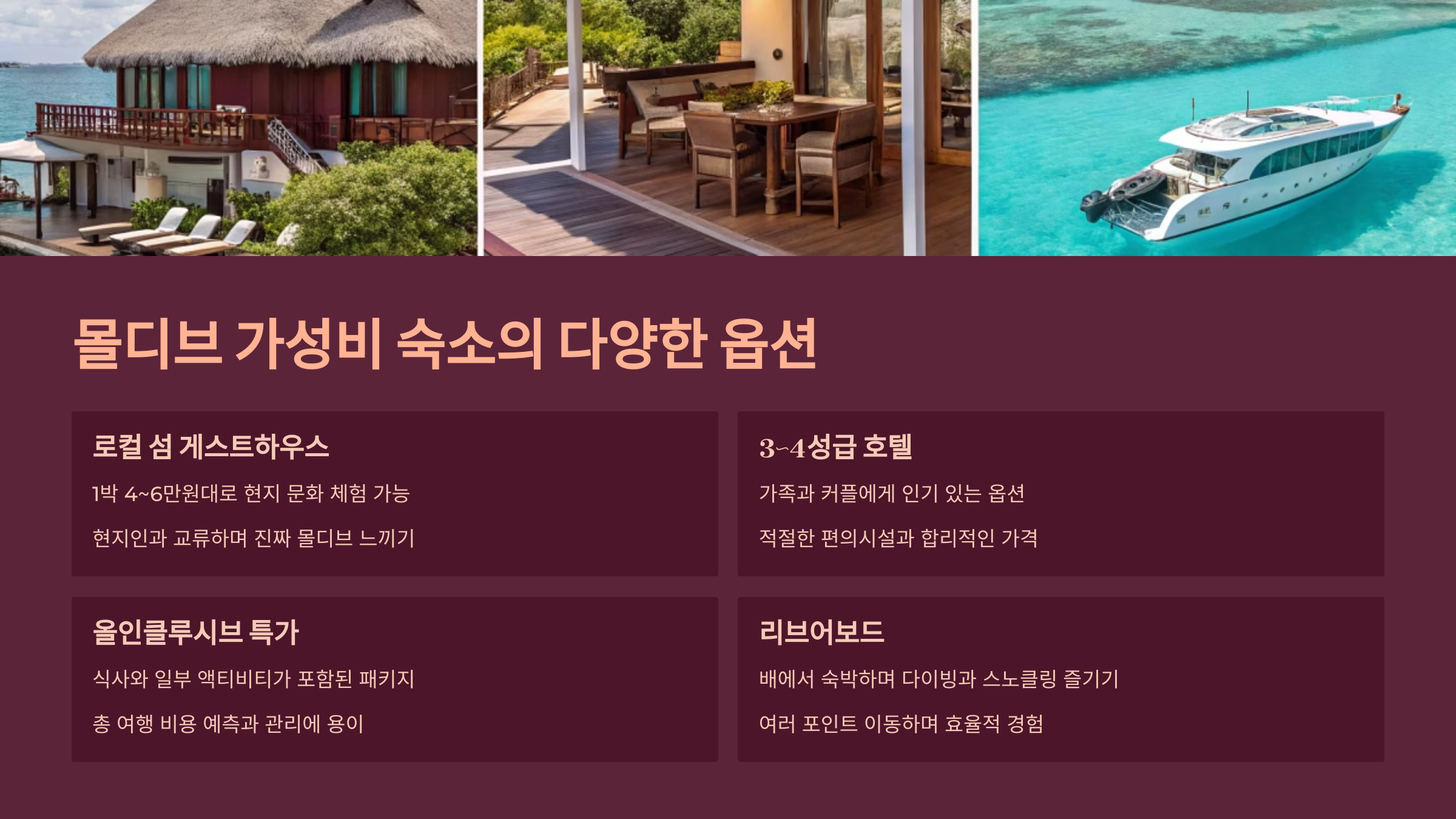 럭셔리 리조트 외에도 몰디브에서 고려해볼 만한 가성비 숙소 옵션들입니다.