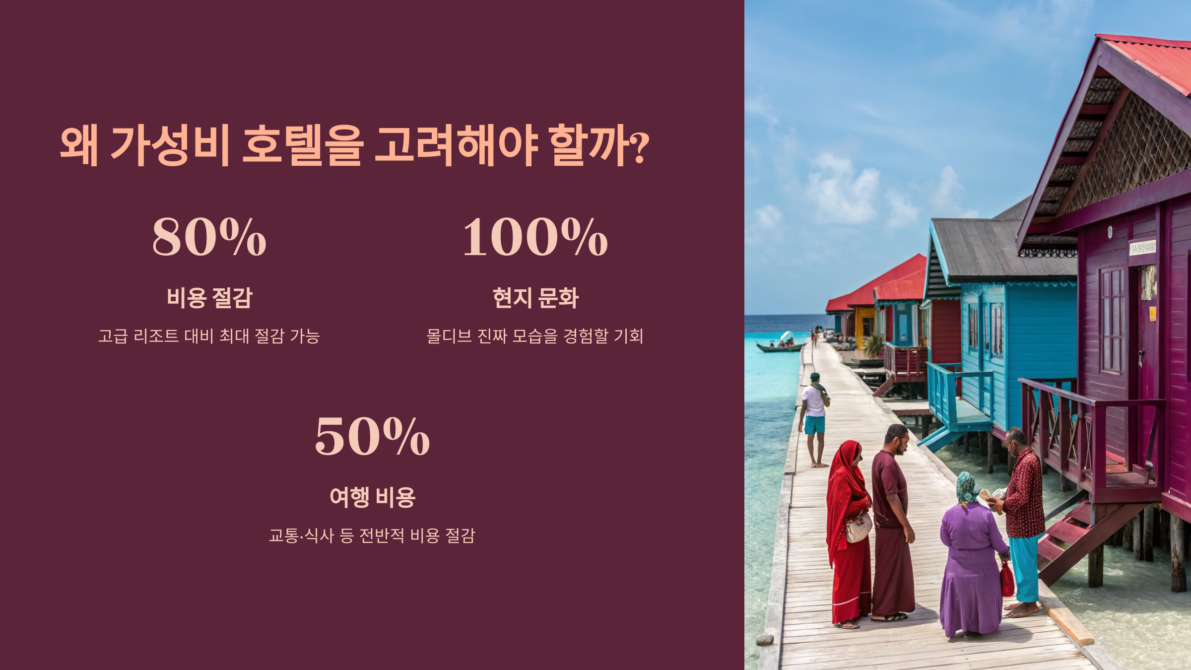 - 💰 여행 경비 대폭 절감: 숙박비는 몰디브 여행 경비에서 가장 큰 비중을 차지합니다. 가성비 숙소는 이 부담을 크게 줄여줍니다.