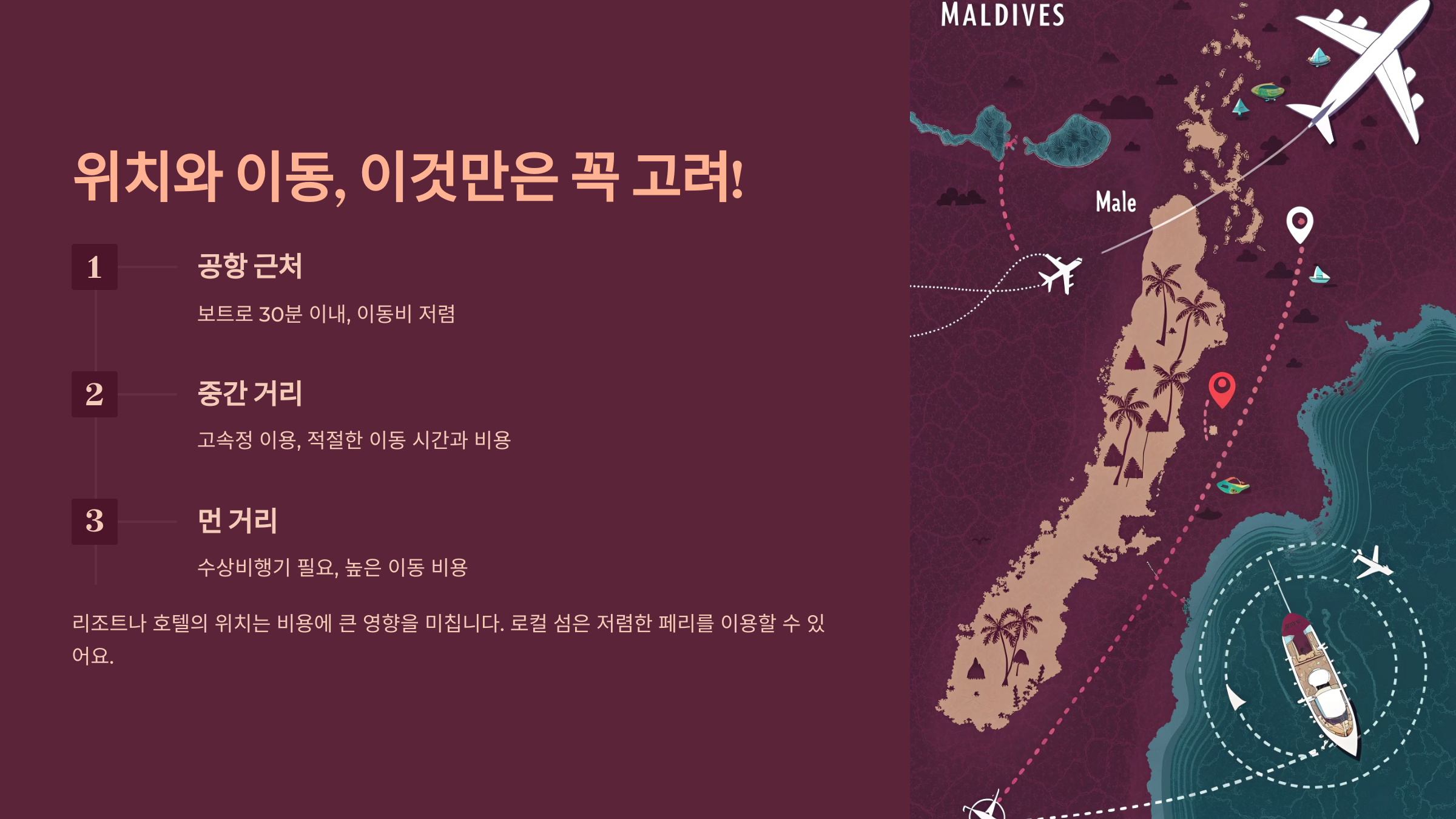 - 교통편(스피드보트/국내선) 비용 포함 여부 확인: 리조트 섬으로 이동하는 교통편 비용이 숙박비에 포함되지 않는 경우가 많습니다. 이 비용까지 고려하여 총예산을 계산해야 합니다. (로컬 섬은 공공 페리 이용 시 저렴)