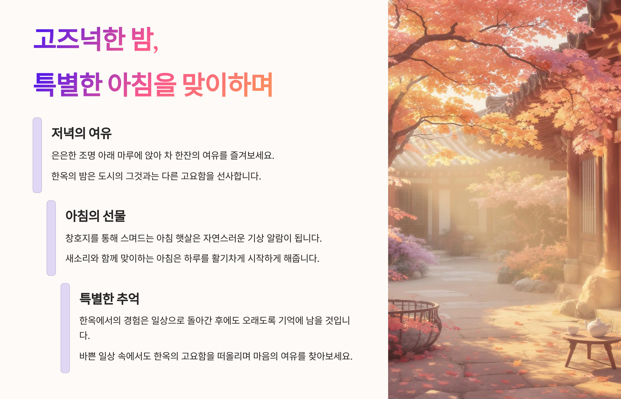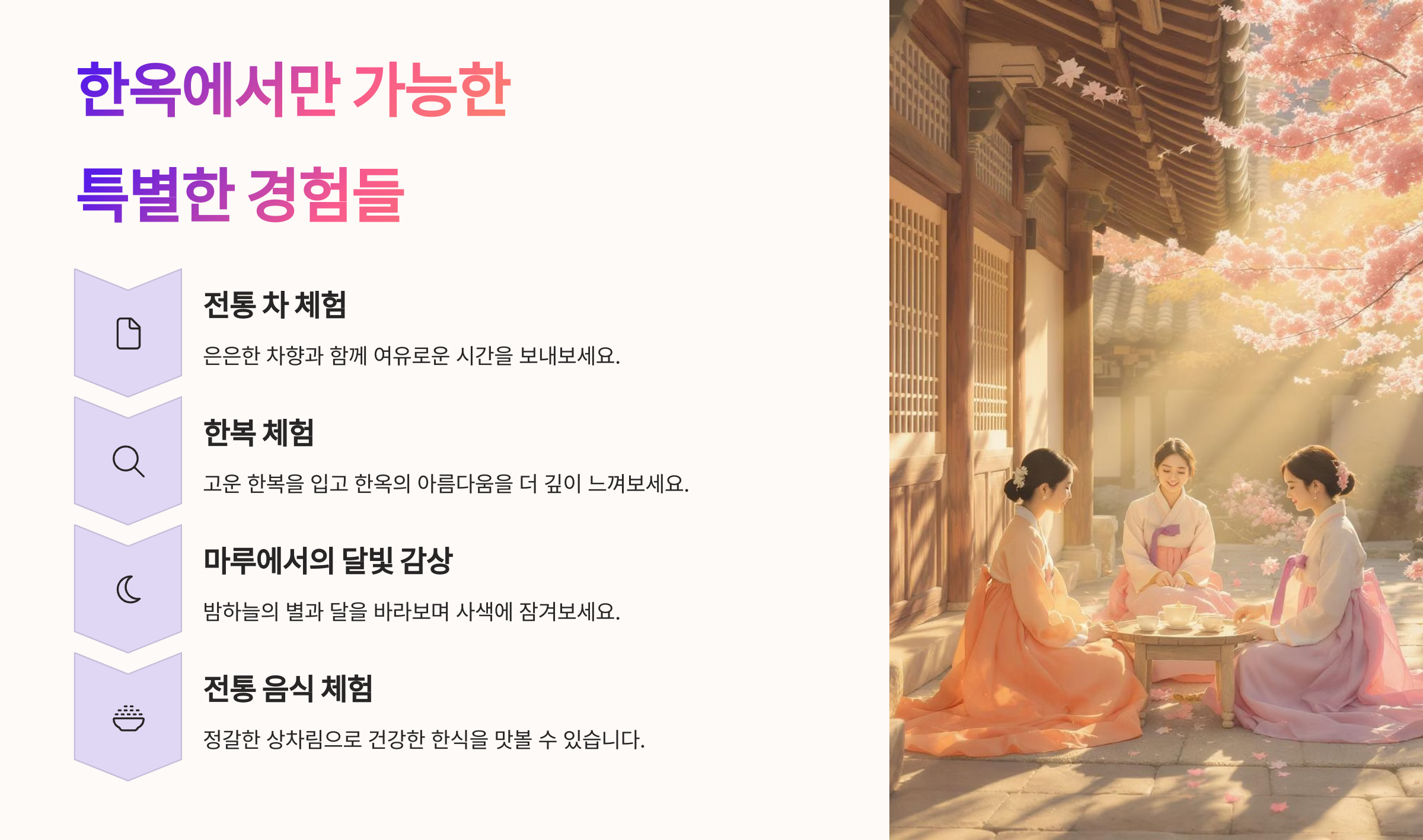 - ✨ 독특하고 기억에 남는 경험: 현대적인 호텔이나 펜션과는 다른, 오직 한옥에서만 느낄 수 있는 특별한 분위기와 경험은 여행을 더욱 풍요롭고 기억에 남도록 만들어줍니다.