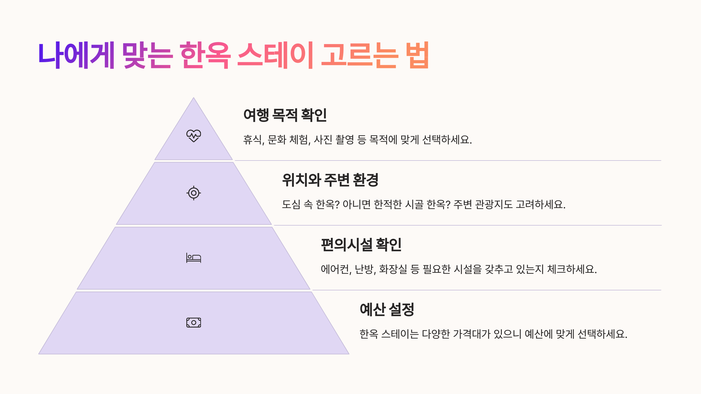 - 목적에 따라 한옥 유형(독채, 고택, 체험형 등) 선택 - 동반자 모두 만족할 수 있는 시설/분위기 고려 |