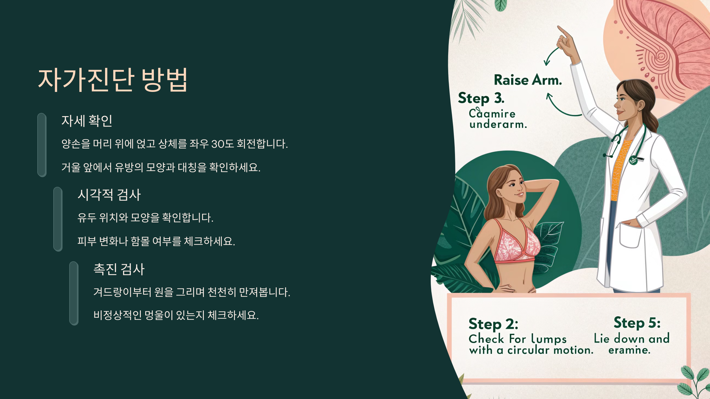 자가진단을 할 때는 통증이 있다고 해서 무조건 암은 아니고, 멍울이 있어도 양성 종양일 수 있어요. 하지만 무시하거나 두려워하지 말고 병원에서 정확히 검사받는 것이 제일 확실한 방법이에요.