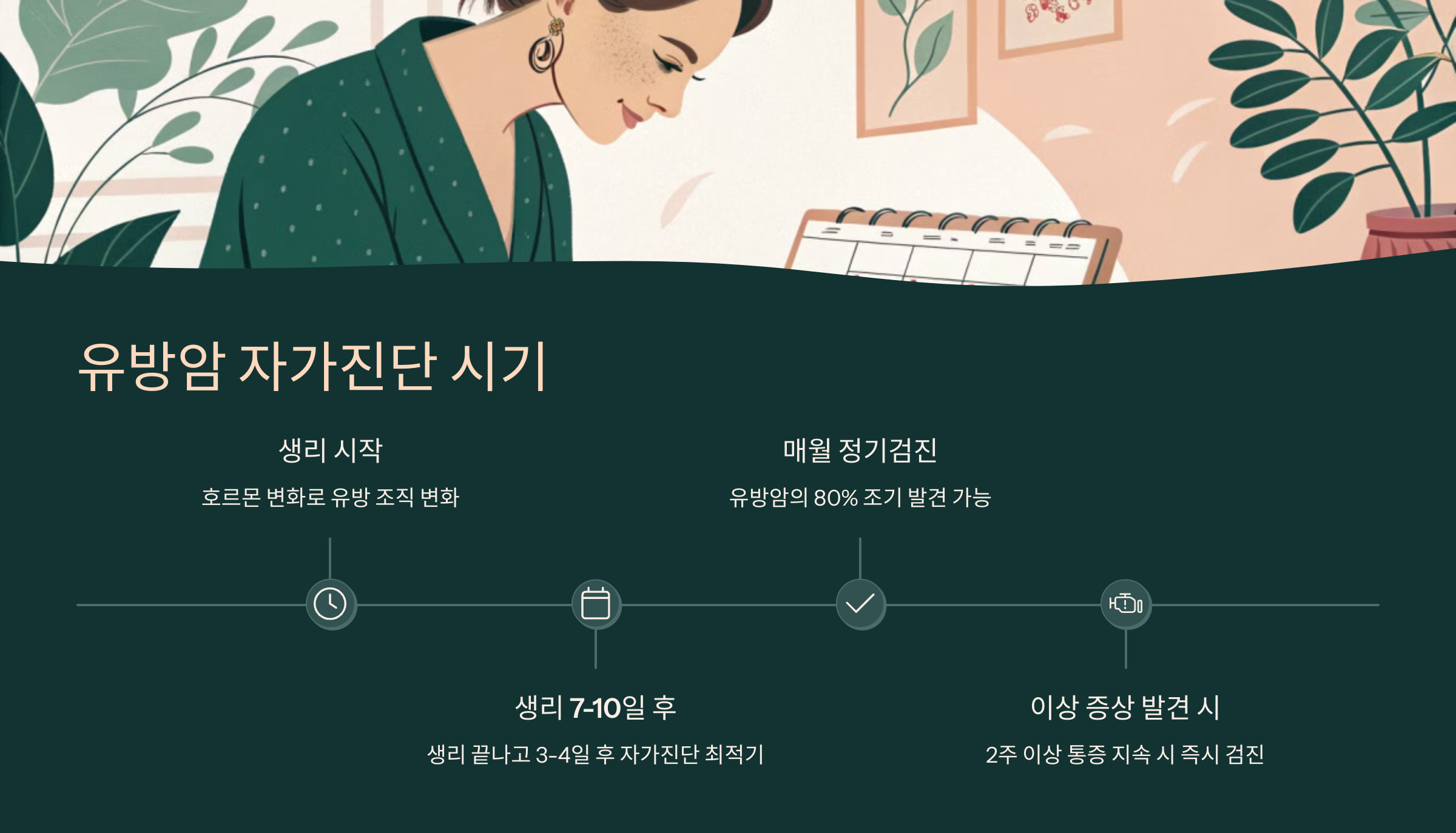 자가진단은 ‘언제 하느냐’가 정말 중요해요. 아무 때나 하면 오히려 부정확할 수 있거든요. 유방 조직은 여성호르몬의 영향을 많이 받기 때문에, 시기를 잘 골라야 정확하게 체크할 수 있어요.