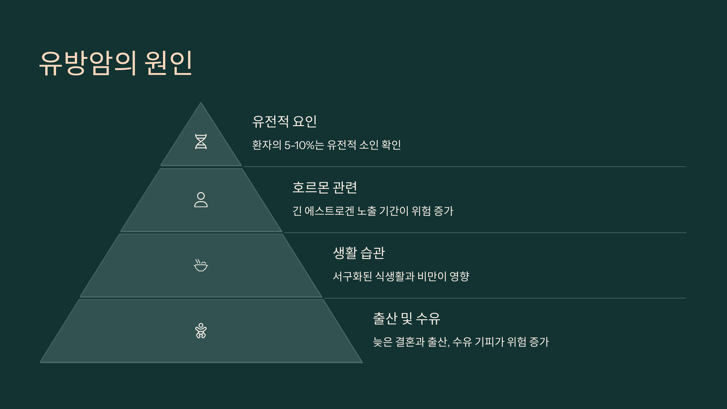 | 유전적 요인 | BRCA1/BRCA2 돌연변이, 가족력 |