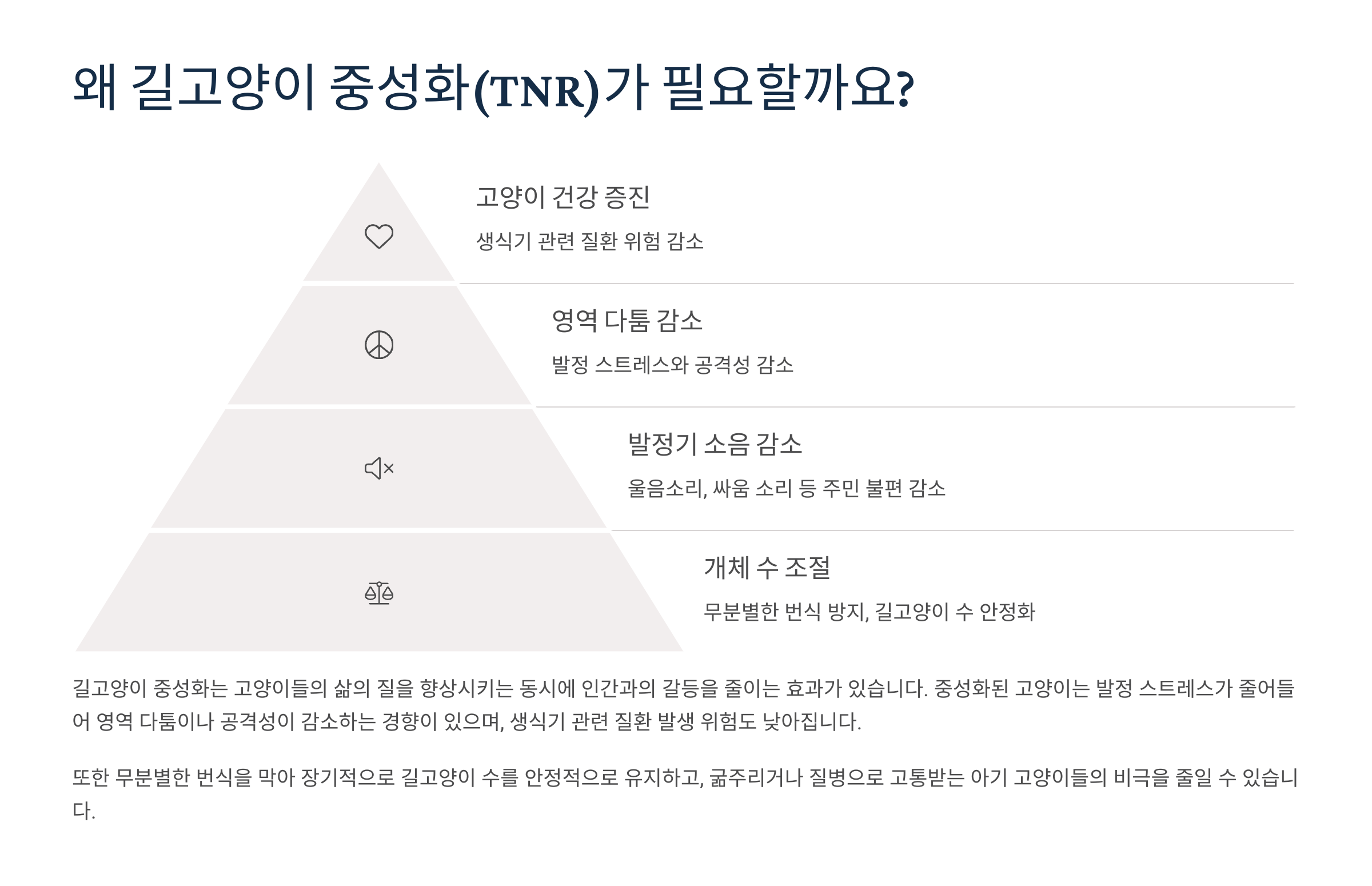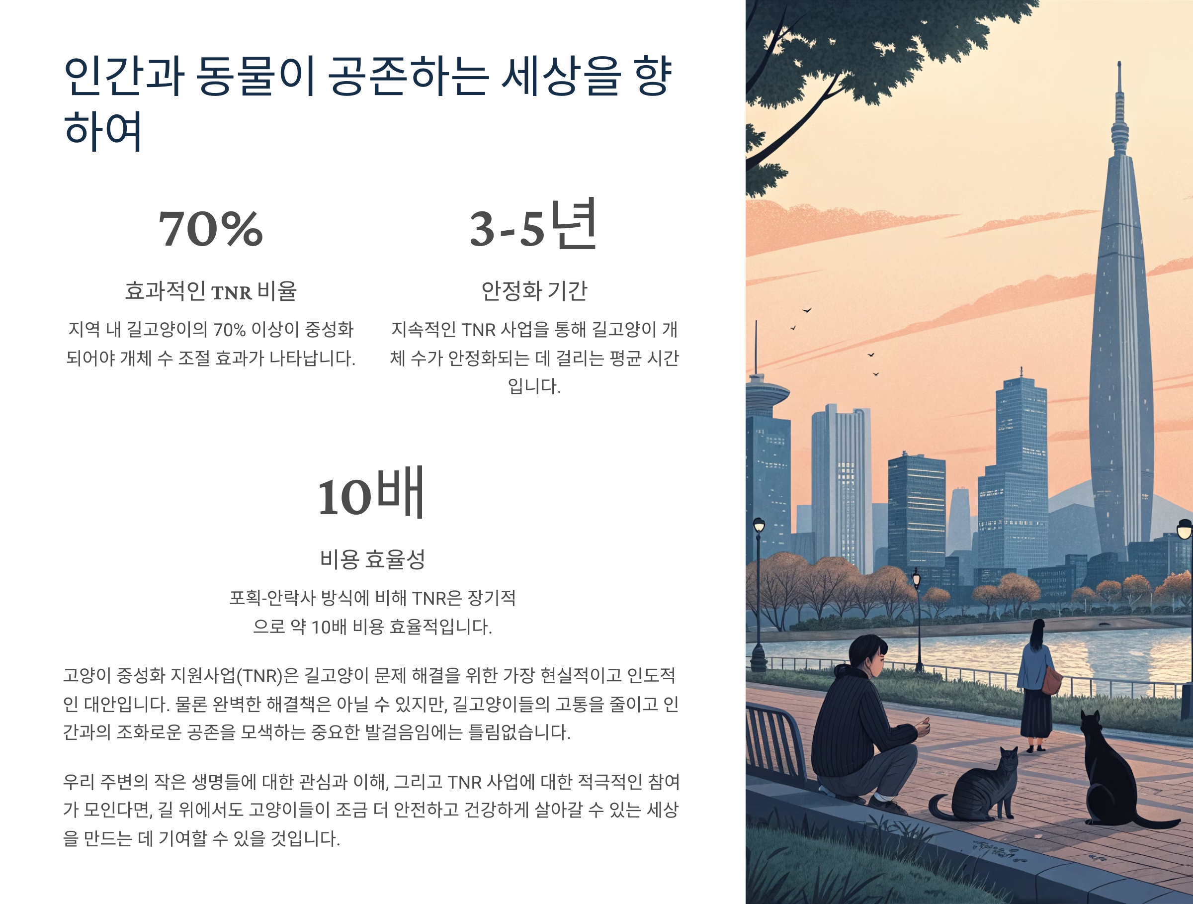 - 인간과의 공존 모색: 길고양이로 인한 민원을 줄이고, 인도적인 방식으로 문제를 해결함으로써 인간과 동물이 더불어 살아가는 환경을 만드는 데 기여합니다.