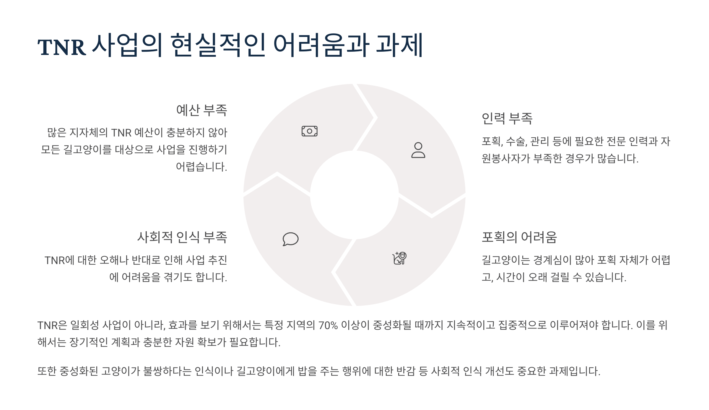 TNR 사업은 많은 긍정적인 효과가 있지만, 현실적으로 다음과 같은 어려움과 과제도 안고 있습니다.