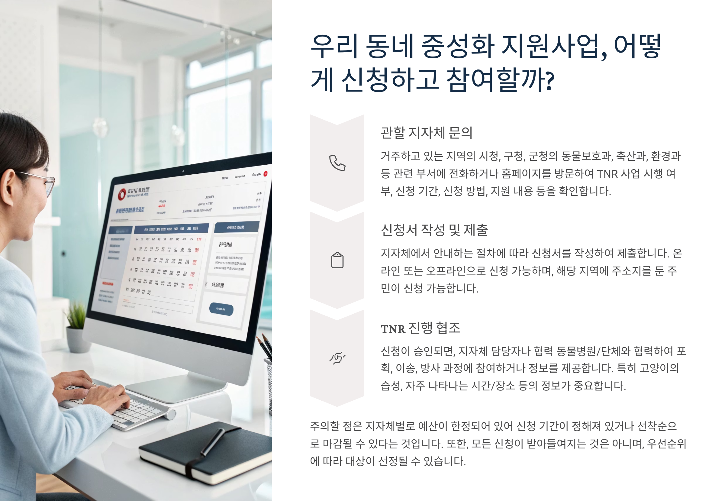 - 관할 지자체(시·군·구청) 문의: 가장 먼저 거주하고 있는 지역의 시청, 구청, 군청의 동물보호과, 축산과, 환경과 등 관련 부서에 전화하거나 홈페이지를 방문하여 TNR 사업 시행 여부, 신청 기간, 신청 방법, 지원 내용 등을 확인합니다.