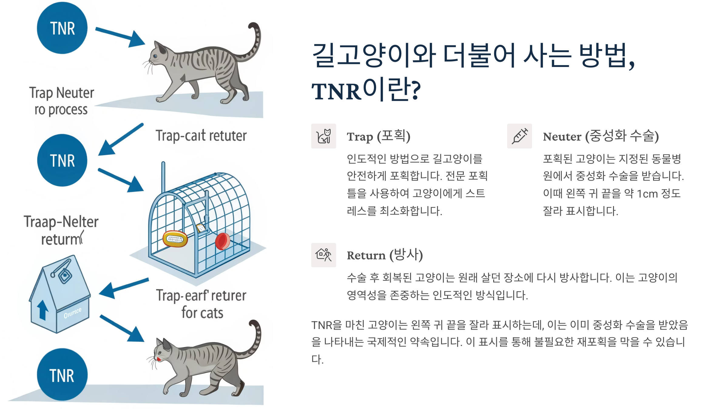 - 지속적인 관리의 필요성: TNR은 일회성 사업이 아니라, 효과를 보기 위해서는 특정 지역의 70% 이상이 중성화될 때까지 지속적이고 집중적으로 이루어져야 합니다.