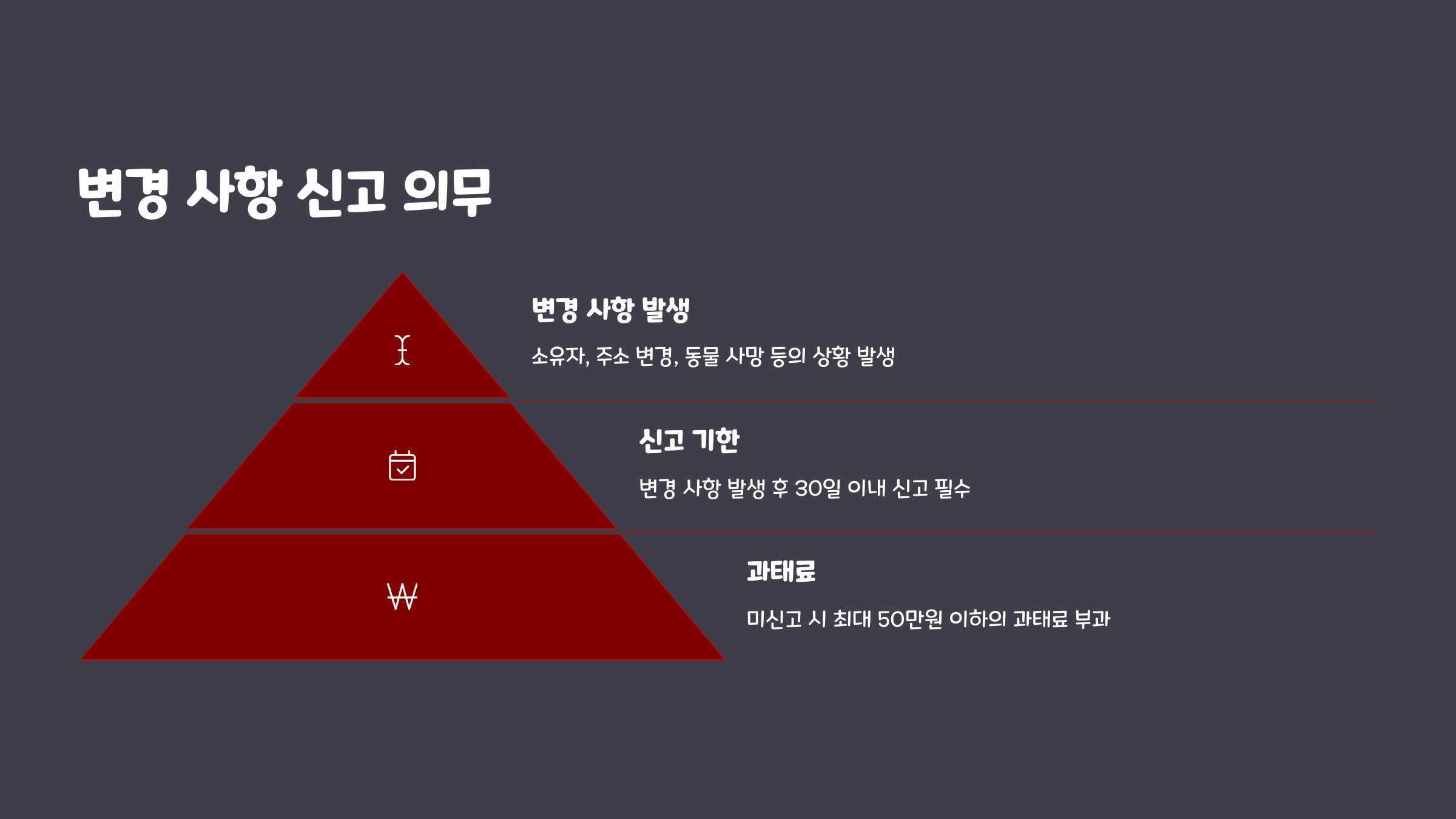 변경 신고는 동물등록 대행기관 방문 또는 동물보호관리시스템을 통해 가능합니다. 미신고 시 과태료가 부과될 수 있습니다.