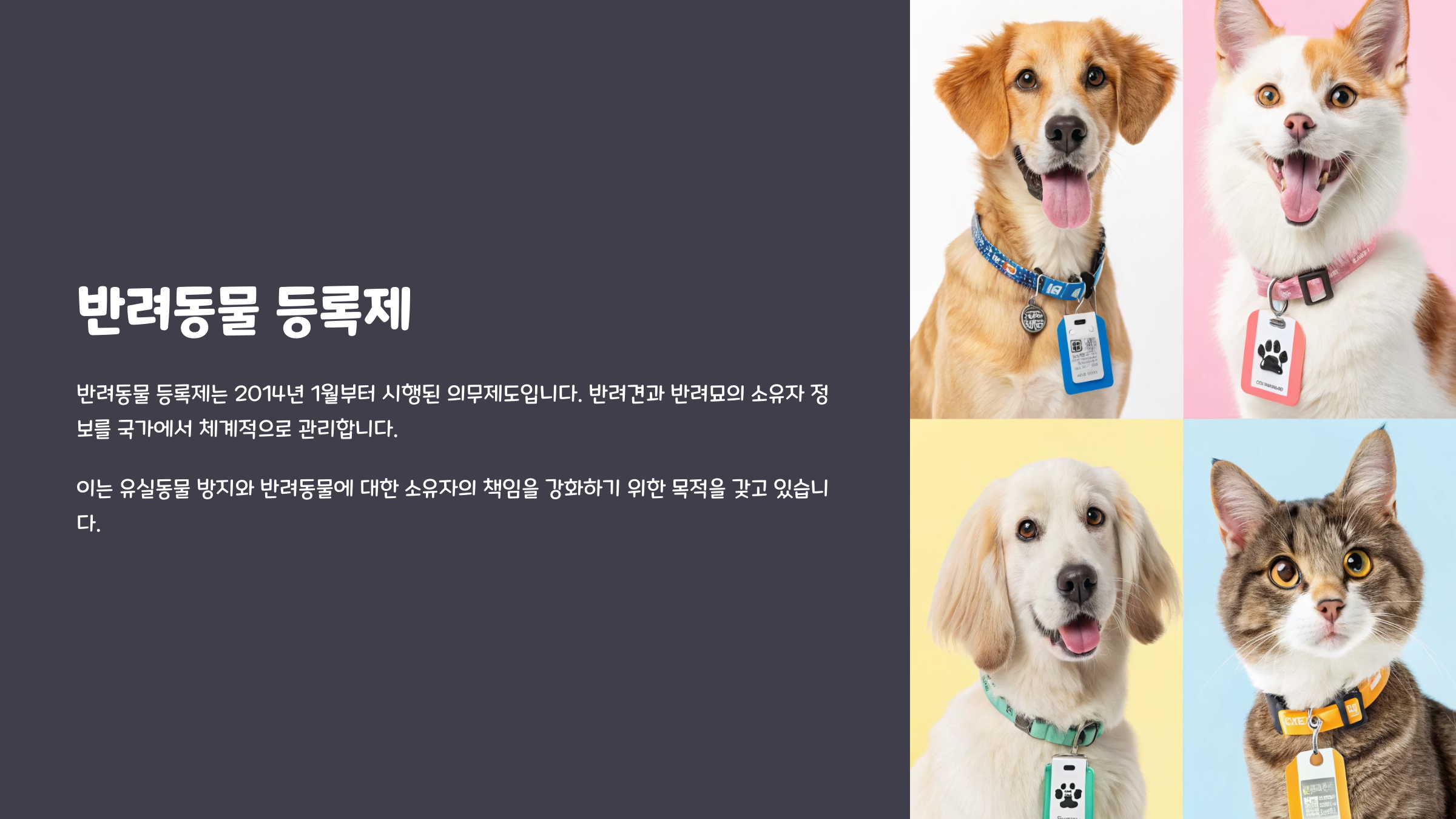 이는 반려동물을 체계적으로 관리하여 유실·유기동물 발생을 줄이고, 광견병 등 인수공통전염병 관리에도 도움을 주기 위한 목적을 가지고 있습니다.