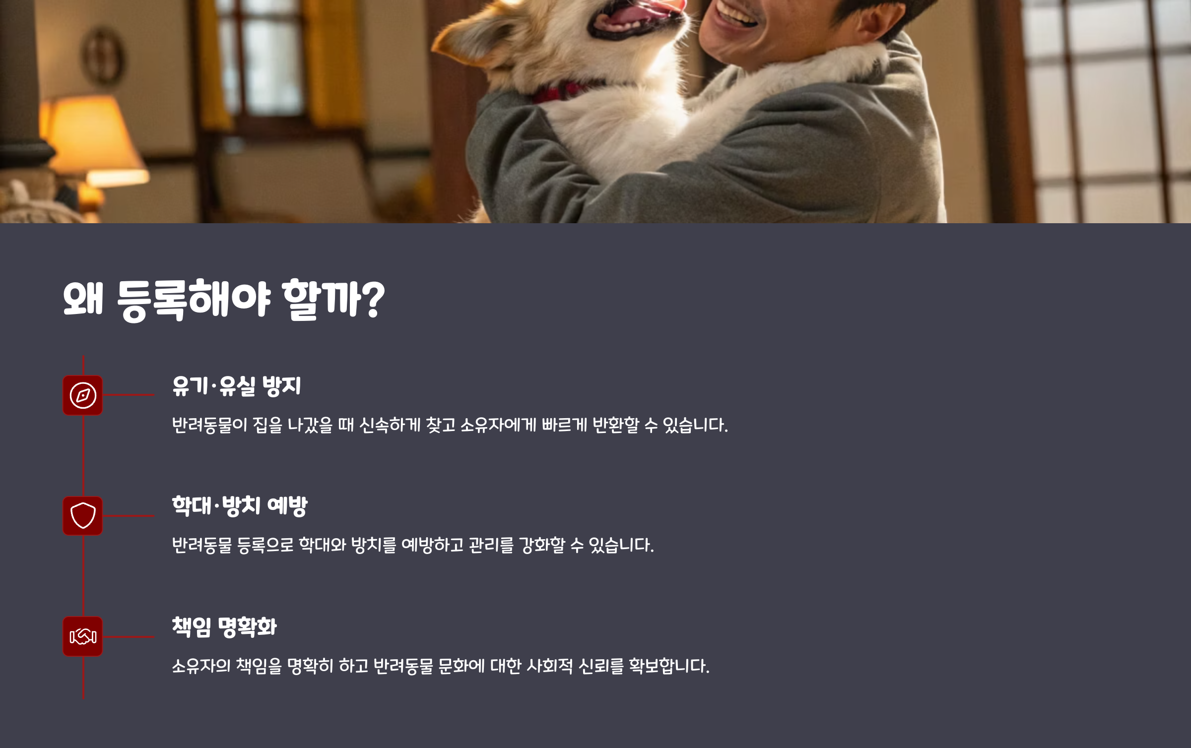 반려동물 등록은 우리 아이를 지키고, 더 나은 반려동물 문화를 만드는 첫걸음입니다. 아직 등록하지 않으셨다면 지금 바로 신청하세요!